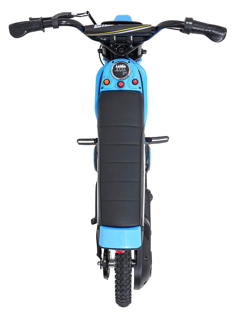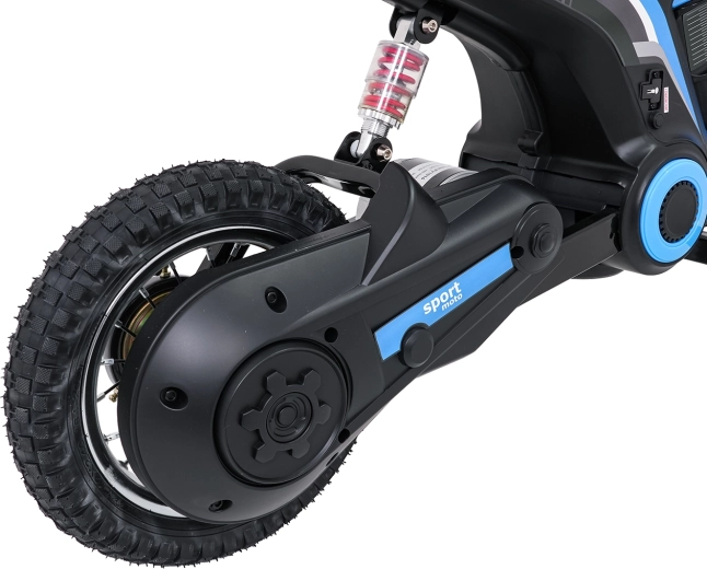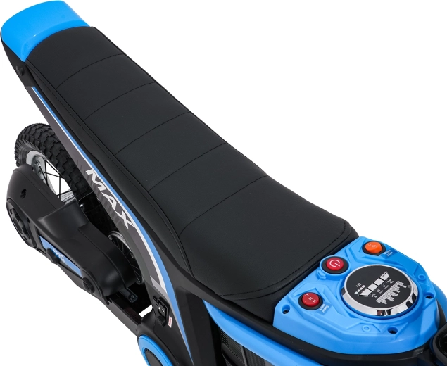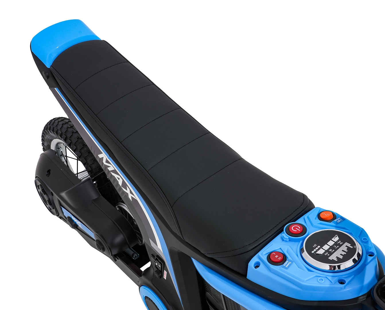 Stylová dětská elektrická motorka RZ56 Max v modré barvě nabízí silný 350W motor s řetězovým převodem, dvojitou baterii 24 V (2× 12 V 10 Ah) pro delší jízdu a nafukovací off-road pneumatiky 30 × 5 cm pro skvělou přilnavost. Díky 3 rychlostním režimům, plynulému rozjezdu a pohodlnému sedlu z ekokůže je ideální pro zábavnou a bezpečnější jízdu dětí. Nechybí LED osvětlení vzadu, Bluetooth audio panel s melodiemi, klaksonem a přehledným ovládáním na řídítkách.