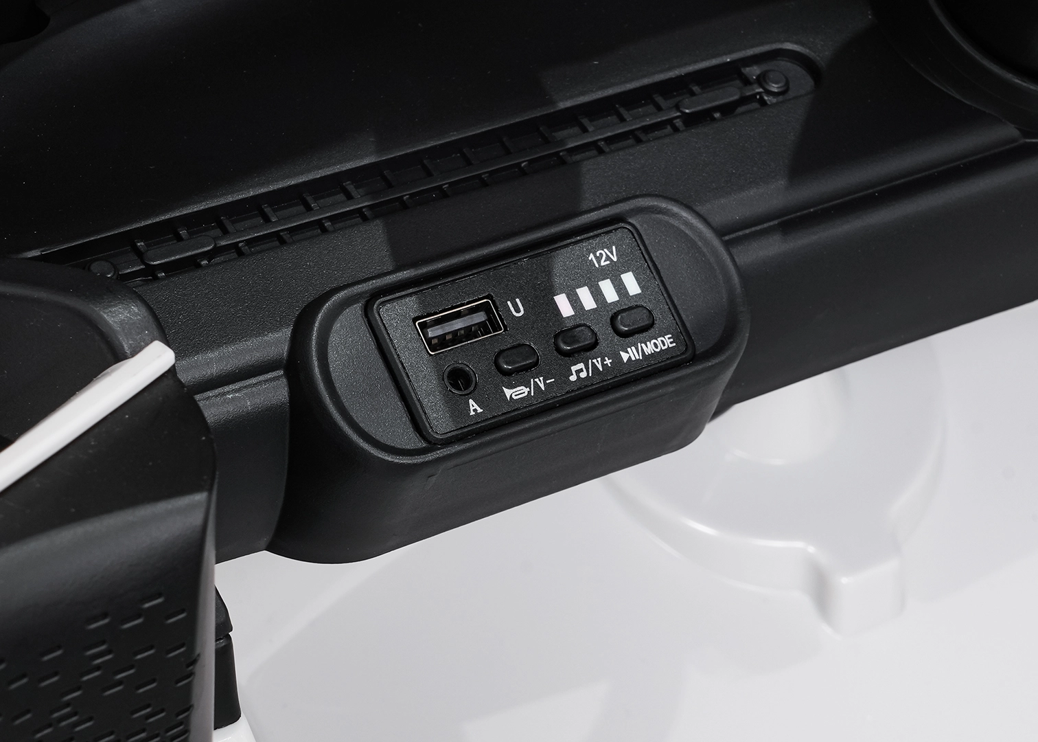 Rodičovská kontrola je samozřejmostí – pomocí dálkového ovladače 2,4 GHz můžete volit ze tří rychlostí, měnit směr jízdy a v případě potřeby využít bezpečnostní tlačítko Stop. Dítě může řídit i samostatně volbou vpřed/vzad a dvěma rychlostmi. Bohatá multimediální výbava s MP3, Bluetooth, USB a AUX, stejně jako zvuky a klakson na volantu, se postará o spoustu zábavy.