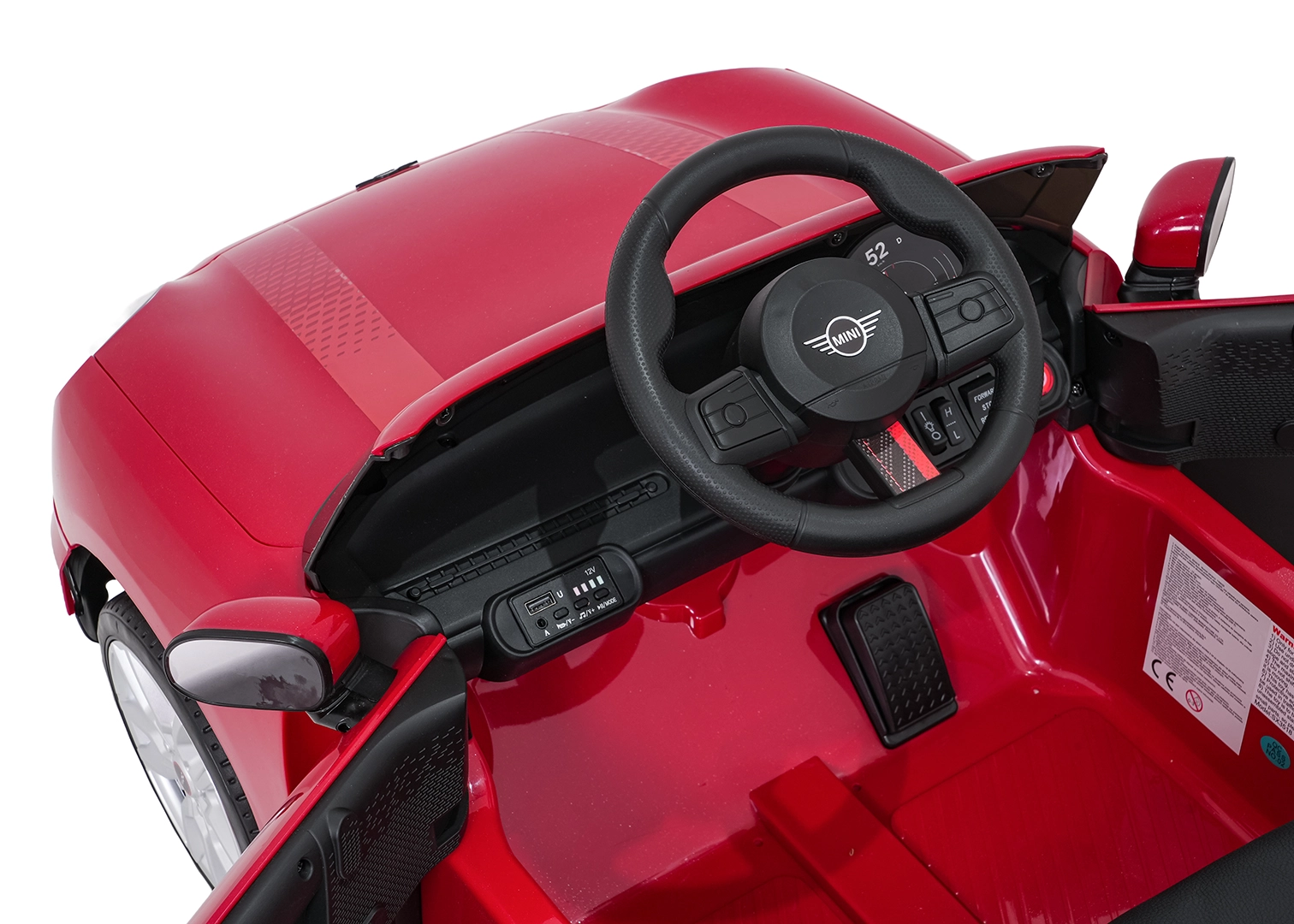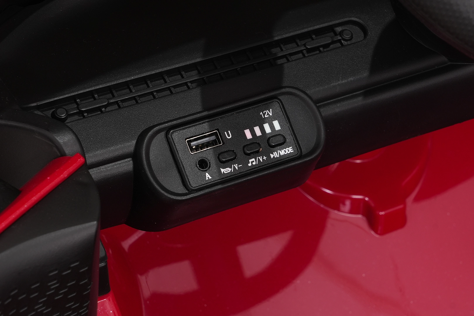 O zábavu na cestách se postará multimediální panel: MP3, Bluetooth, USB, AUX, zvuky a klakson na volantu a ukazatel nabití baterie. Maximální nosnost je 30 kg, průjezdnost zvyšuje světlá výška 8 cm. Součástí balení je nabíječka a návod k montáži.