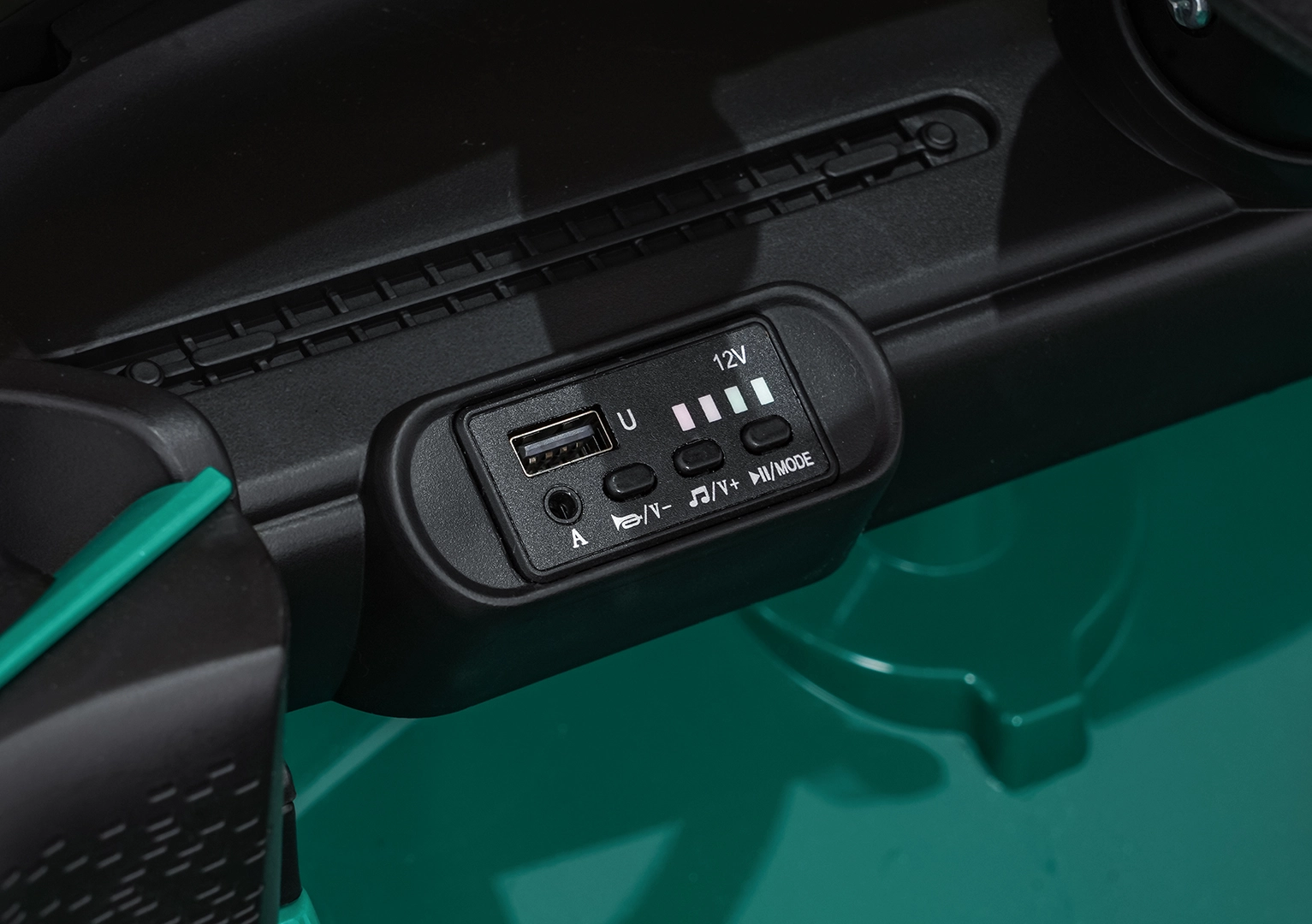 Interiér potěší audio panelem s USB/MP3/AUX a Bluetooth, takže si děti mohou přehrát oblíbené písničky. Měkké EVA kola 19×6 cm tlumí vibrace a sedadlo z eko kůže s bezpečnostním pásem přidává na pohodlí i bezpečí. Otevírací dveře a přehledný ukazatel stavu baterie dotvářejí autentický zážitek.