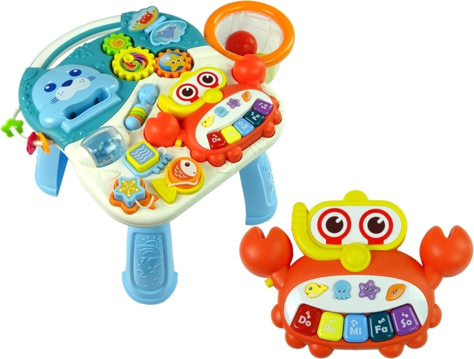 Barevné klávesy, převody, vkládací tvary, otočné kostky a koš s míčky rozvíjejí motoriku, logiku i sluch. Panel lze odejmout a používat samostatně.