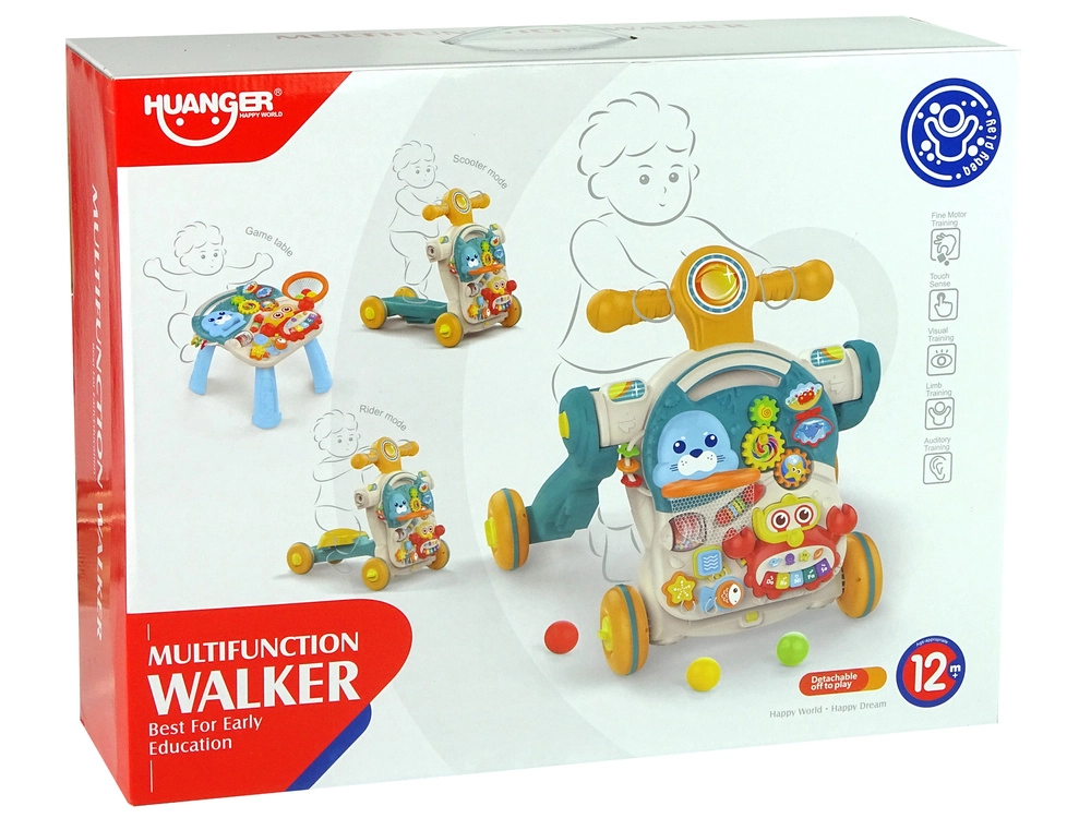 Univerzální pchací chodítko a hračka 4v1 pro děti od 12 měsíců: chodítko, edukační stolek, odrážedlo a koloběžka. Odnímatelný interaktivní panel s klavírem, ozubenými kolečky, tvary a košem na míčky podporuje motoriku, smyslový rozvoj a učení chůze. Bezpečná konstrukce s protiskluzovými koly a možností brzdy/blokace kol.