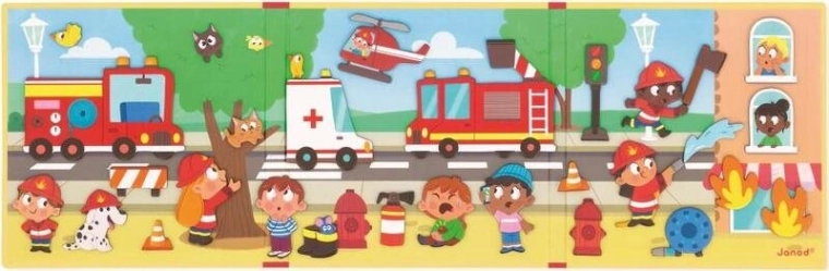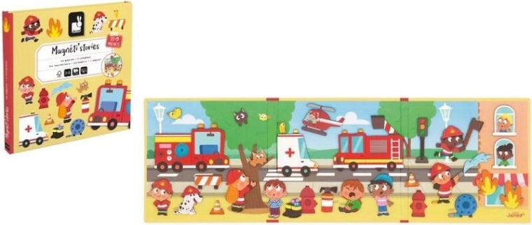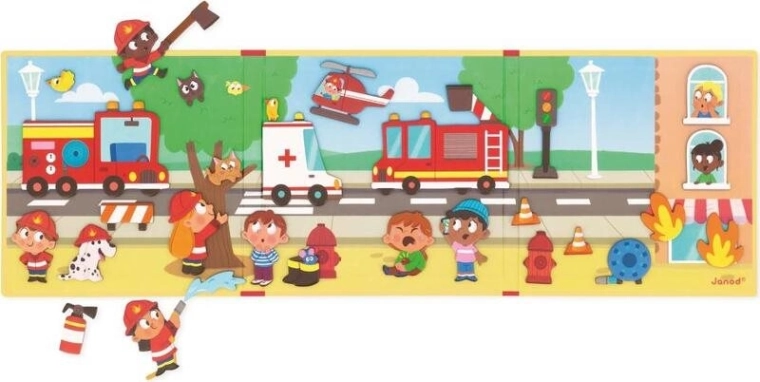 Objevte zábavnou magnetickou knihu s tématem hasičů od značky JANOD, která dětem umožní vytvářet vlastní příběhy pomocí 30 magnetek. Podporuje fantazii, kreativitu a vyprávění, je lehké, tenké a snadno přenosné a díky magnetům jednotlivé dílky pevně drží na pozadí – ideální na doma i na cesty.