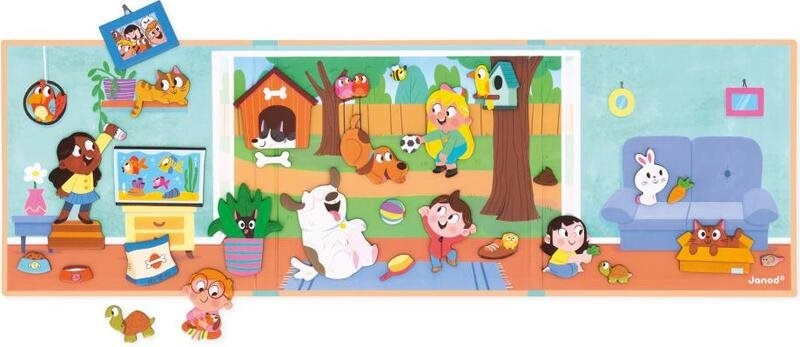 Objevte kouzlo vyprávění s magnetickou knihou JANOD Domácí mazlíčci. Díky velkému magnetickému pozadí a 30 pestrým magnetkám si děti složí vlastní scény se zvířátky, trénují představivost a rozvíjejí slovní zásobu. Kniha se snadno otevírá, je tenká a lehká – ideální společník na cesty i na hraní doma.