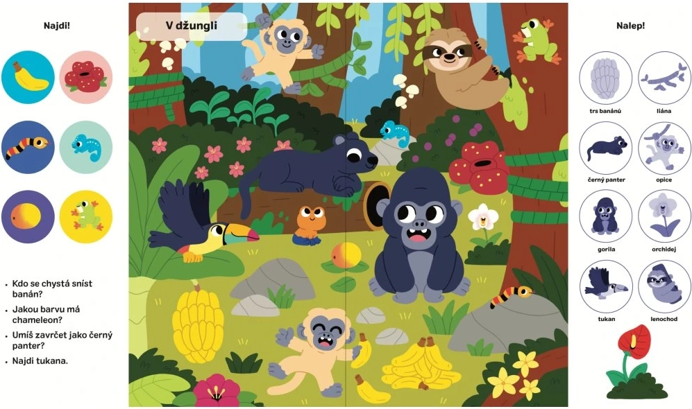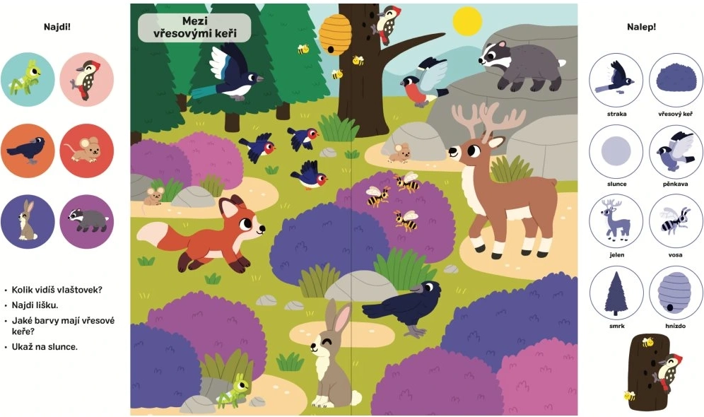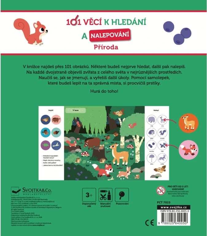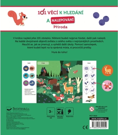 Sešit SVOJTKA & CO. 101 věcí k hledání a nalepování: Příroda je ideální pro zvídavé děti, které milují samolepky, hledání a objevování. Na každé dvojstraně je čekají scény z různých prostředí – od lesa a savany až po oceán – kde budou vyhledávat obrázky, odpovídat na otázky a doplňovat chybějící prvky.