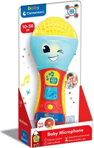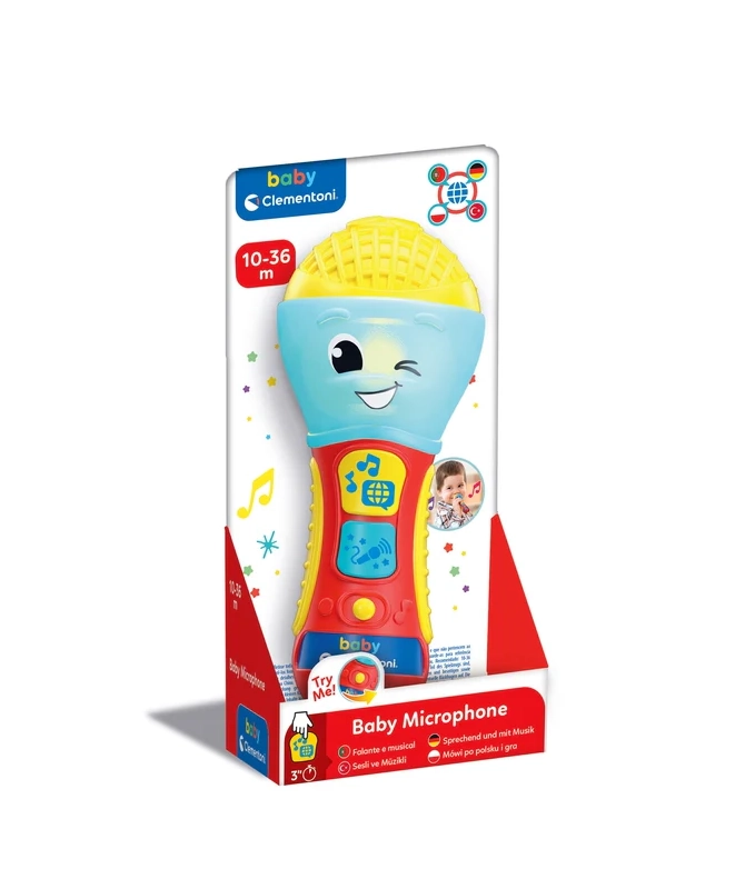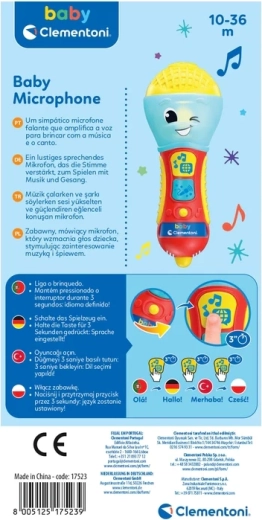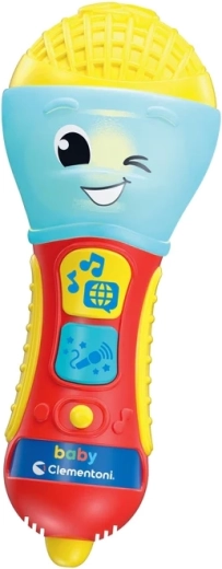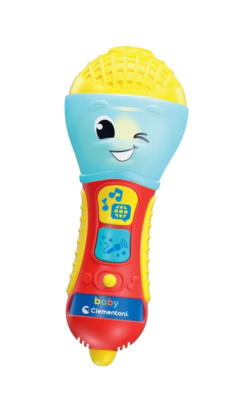 Dětský mluvící mikrofon CLEMENTONI je skvělá interaktivní hračka pro malé zpěváky a zpěvačky. Prostřednictvím písniček, podkresové hudby a jednoduchých frází učí první písmena a nová slova ve 4 jazycích. Barevná LED dioda a 2 funkční tlačítka se postarají o poutavou světelnou show a zábavné efekty.