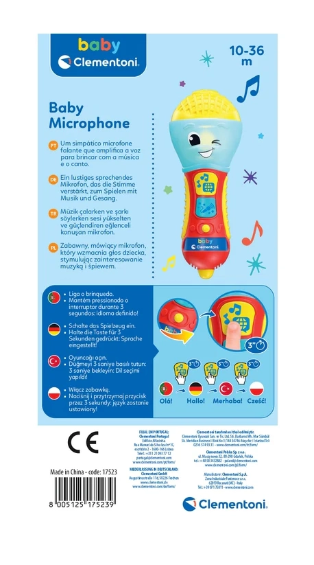 Roztomilý a edukativní mikrofon pro nejmenší, který spojuje zábavu a učení prvních písmen a slov ve čtyřech jazycích: polštině, němčině, portugalštině a turečtině. Nabízí světelné a zvukové efekty, zesílení hlasu jako u skutečného mikrofonu a podporuje rozvoj řeči, slovní zásoby i jemné motoriky.