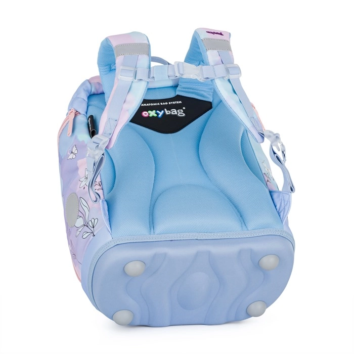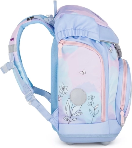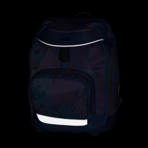 Batoh pro 1.–3. třídu je navržen s důrazem na správné držení těla – má anatomicky tvarovaný zádový panel (cca 33 cm), polstrované a nastavitelné ramenní popruhy i hrudní popruh. Stabilitu zajišťuje pevné dno s plastovými nožkami, které brání převrhnutí. Praktické řešení nabízí vnitřní rozřaďovač, přední kapsu na svačinu a boční kapsy na láhev. Hlavní komora se zavírá stahovací šňůrkou a magnetickým zapínáním pro rychlé a bezpečné používání. Viditelnost dítěte zvyšují reflexní prvky.