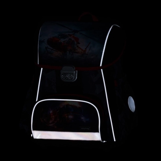 Kompletní školní set pro malé fanoušky hasičů obsahuje ergonomicky tvarovanou aktovku Premium, praktický jednopatrový penál a šňůrkový sáček na cvičky či přezůvky. Aktovka má vyztužená záda, prodyšné polstrování, široké měkčené popruhy a množství reflexních prvků pro bezpečnost. Stabilní dno, přehledný vnitřek a bezpečnostní kovová přezka zaručují pohodlné a bezpečné nošení v 1.–2. třídě.