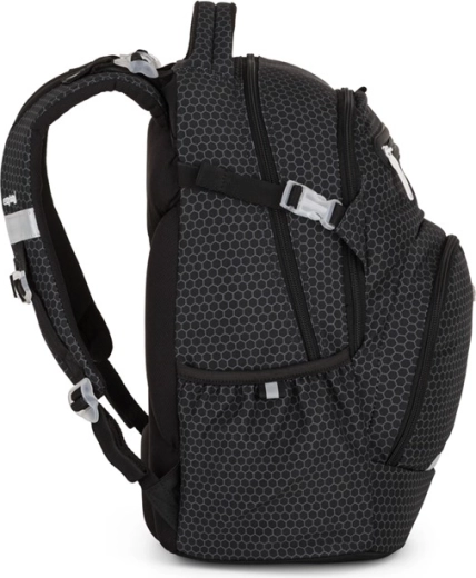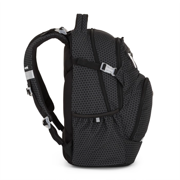 Dvě prostorné hlavní komory snadno pojmou sešity, učebnice i penál, do přední kapsy se vejde menší svačina nebo drobnosti. Boční síťované kapsy na gumu jsou ideální pro láhev na pití, kterou má školák vždy po ruce. Pevné dno umožňuje, aby batoh stabilně stál a nepřevrhoval se, zatímco reflexní prvky zvyšují viditelnost a bezpečí za šera.