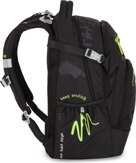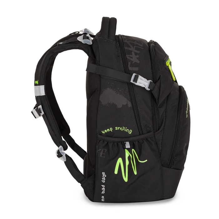 Dvě prostorné komory pojmou učebnice i sešity, přední kapsa je ideální na svačinu a boční elastické kapsy pohodlně drží láhev s pitím.