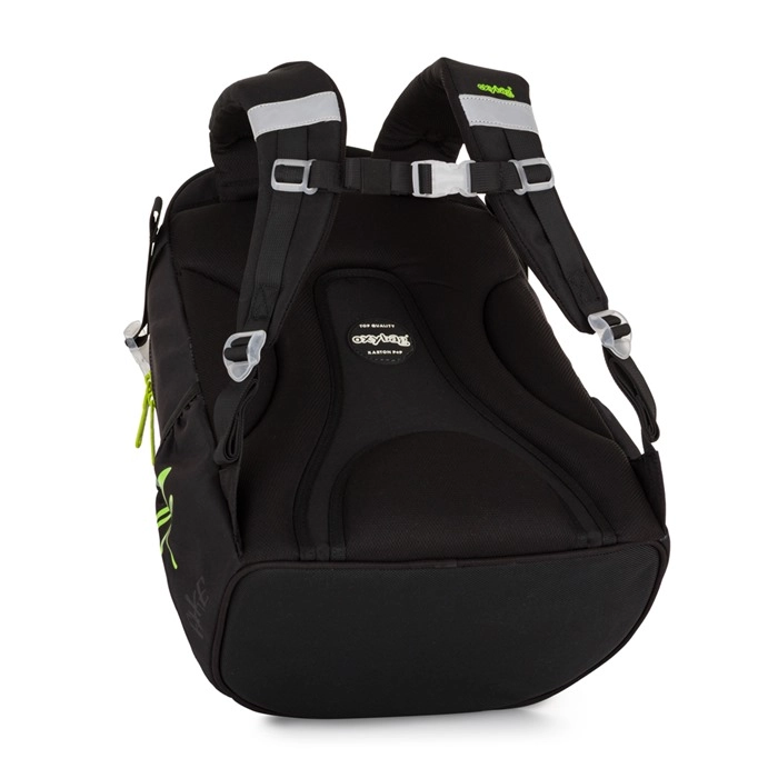 Vnitřní prostor tvoří dvě prostorné komory pro učebnice, sešity a pouzdro, doplněné o přední kapsu na menší svačinu. V bočních elastických kapsách je místo na láhev s pitím, kterou dítě snadno vyndá i vrátí. Pevné, rovné dno udrží batoh samostatně stát a chrání obsah před převržením. Reflexní prvky zvyšují viditelnost a bezpečnost za šera.