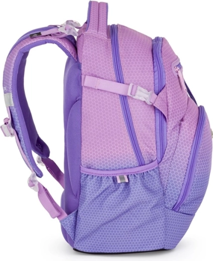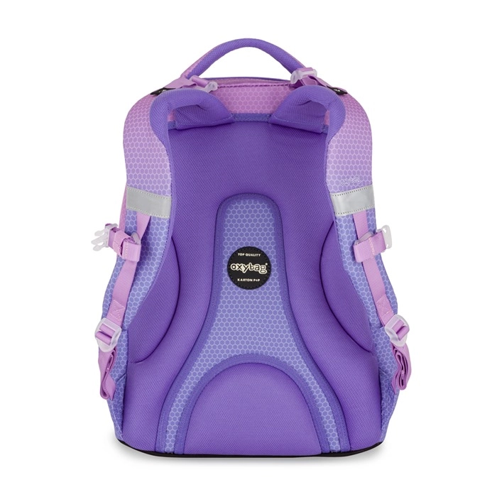 Stylový školní batoh OXY Ombre v růžovo‑fialovém provedení je ideální pro školáky od 3. třídy. Nabízí anatomicky tvarovaný zádový panel, polstrované ramenní popruhy a nastavitelný hrudní popruh pro pohodlné nošení. Díky pevného dna stabilně stojí, má dva prostorné oddíly, boční kapsy na láhev, přední kapsu na svačinu a reflexní prvky pro vyšší bezpečnost.
