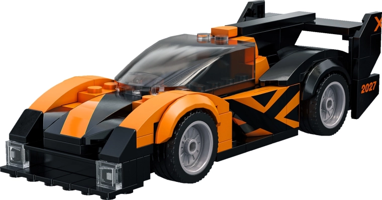 Oranžovo‑černé zbarvení, výrazné spoilerové křídlo a průhledný kokpit dodávají modelu autentický závodní vzhled vhodný pro hraní i vystavení.