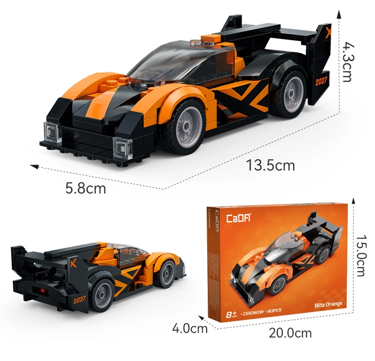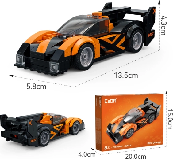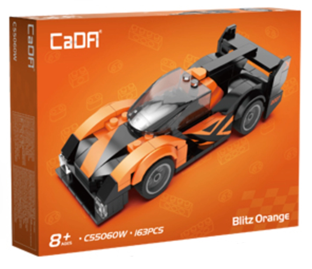Závodní vůz CaDA Blitz Orange potěší všechny milovníky stavění i rychlých aut. Díky 163 přesně lícujícím kostkám si sestavíte kompaktní model s aerodynamickým tvarem, průhledným kokpitem a výraznými světly. Díky funkčním kolům se model hladce pohybuje po rovném povrchu – ideální pro hraní i vystavení.