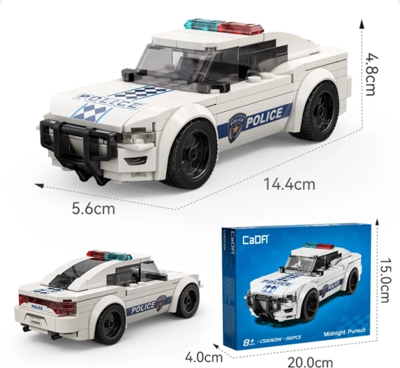 Model Midnight Pursuit vyniká čistými liniemi, sportovním vzhledem a drobnými prvky, které podtrhují policejní charakter vozu. Po sestavení získáte statický model s otáčejícími se koly, který poslouží jak ke hraní, tak jako stylová dekorace na polici.