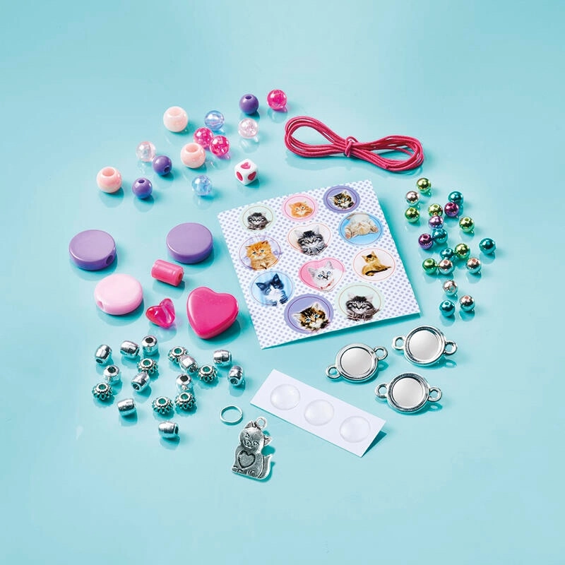 - 3× přívěsek, 1× přívěsek koťátko, 3× průhledná samolepka, nálepky s koťátky, různé korálky, růžové elastické vlákno, kovový kroužek, návod