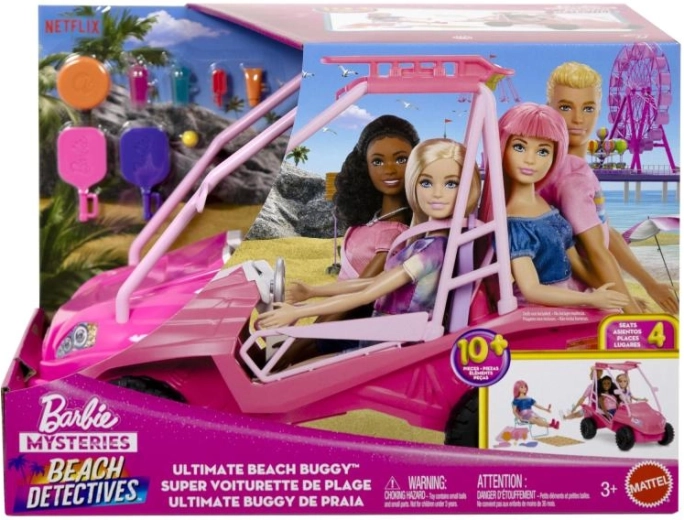 Vyrazte za dobrodružstvím s růžovou plážovou buginou BARBIE, která nabízí místo až pro čtyři panenky, robustní terénní kola a praktický nosič na střeše. Více než 10 plážových doplňků – včetně křesílka, ručníku, chladicího boxu a svačinek – podněcuje kreativní hru a vyprávění příběhů. Ideální pro děti od 3 let. Panenky nejsou součástí balení.