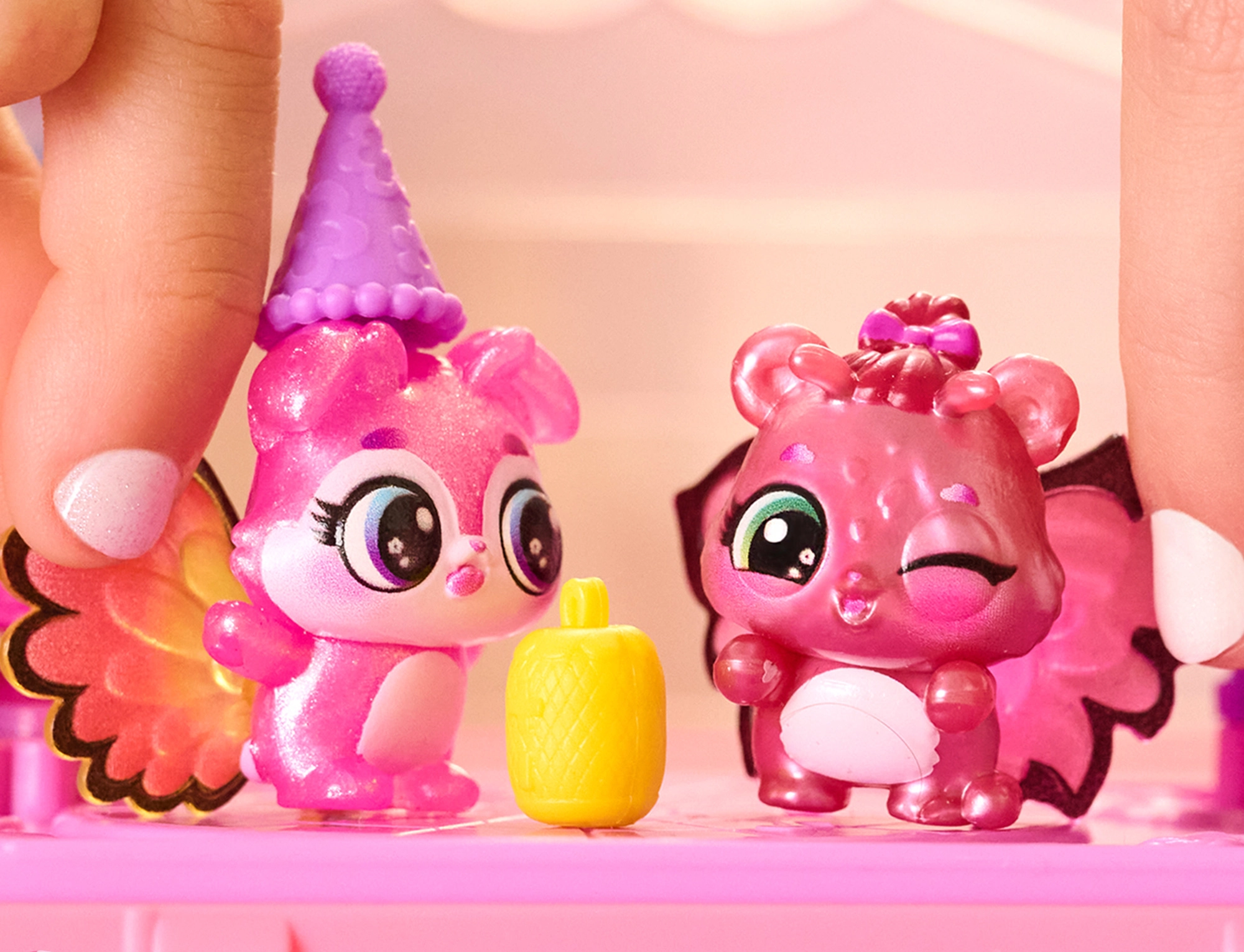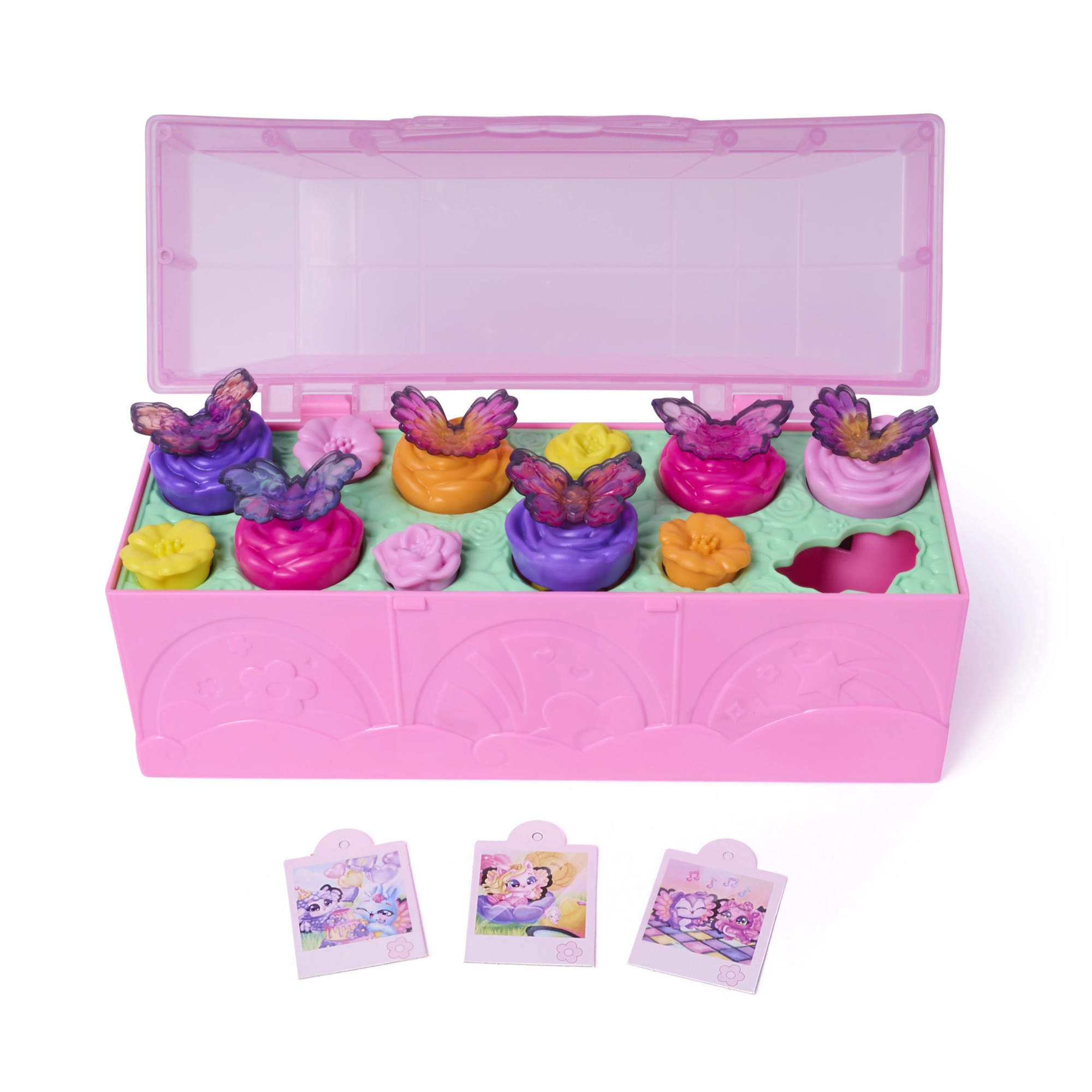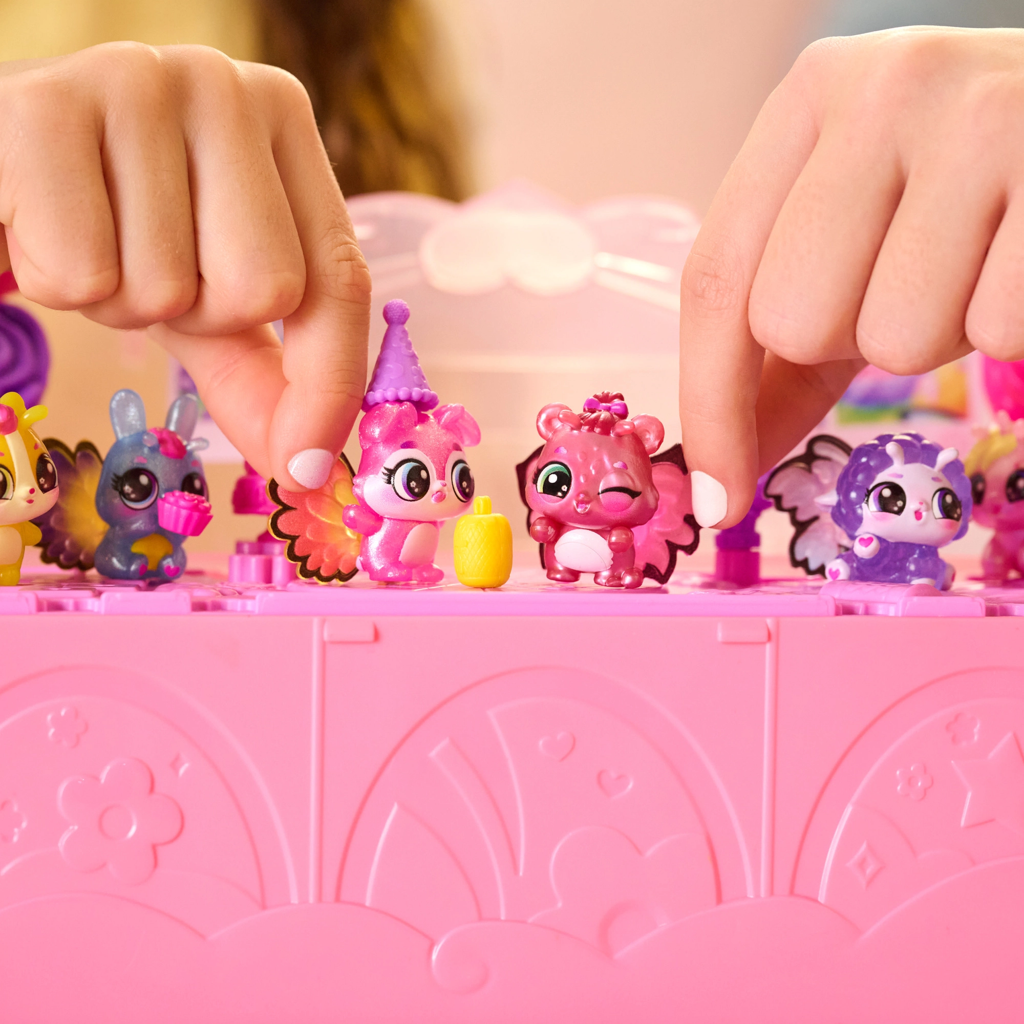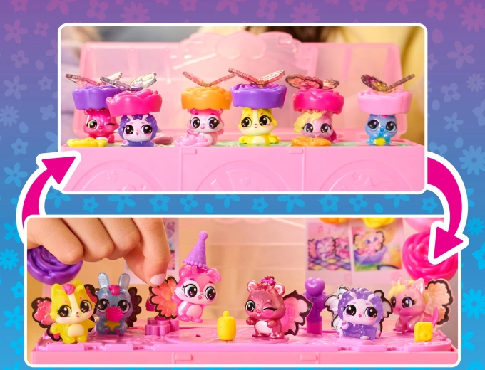 Po odhalení proměňte set v taneční parket, připněte figurkám barevná křidélka a dozdobte víko fotkami Hatchi‑Pics. Zábava začíná!