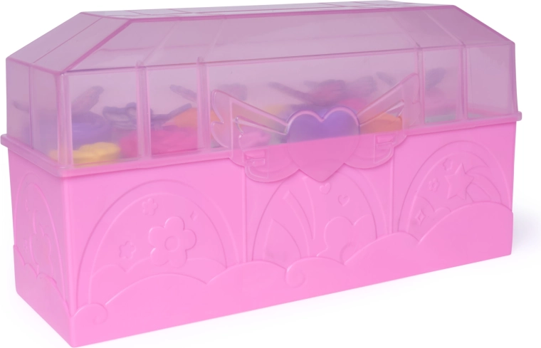 Růžový kufřík s průhledným víkem pojme figurky, květy i doplňky. Slouží jako přenosné úložiště i stylová vitrínka pro sbírku.