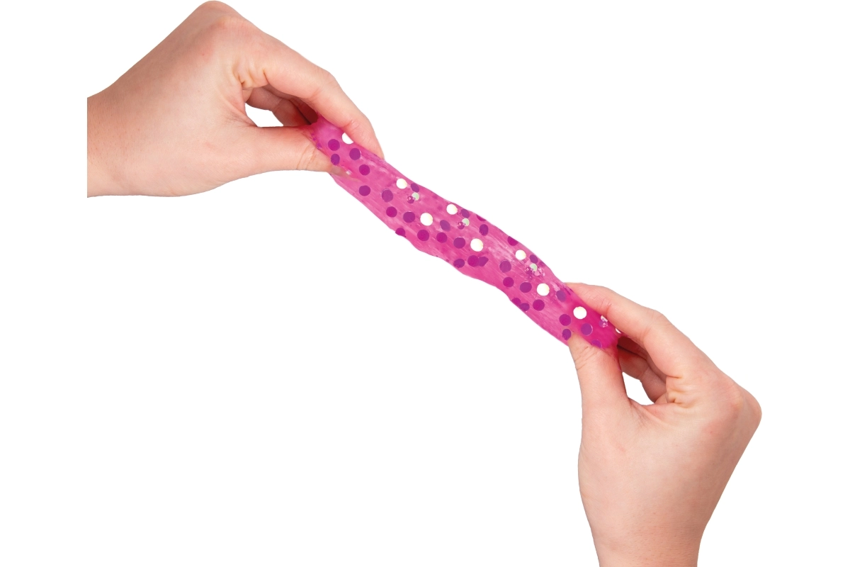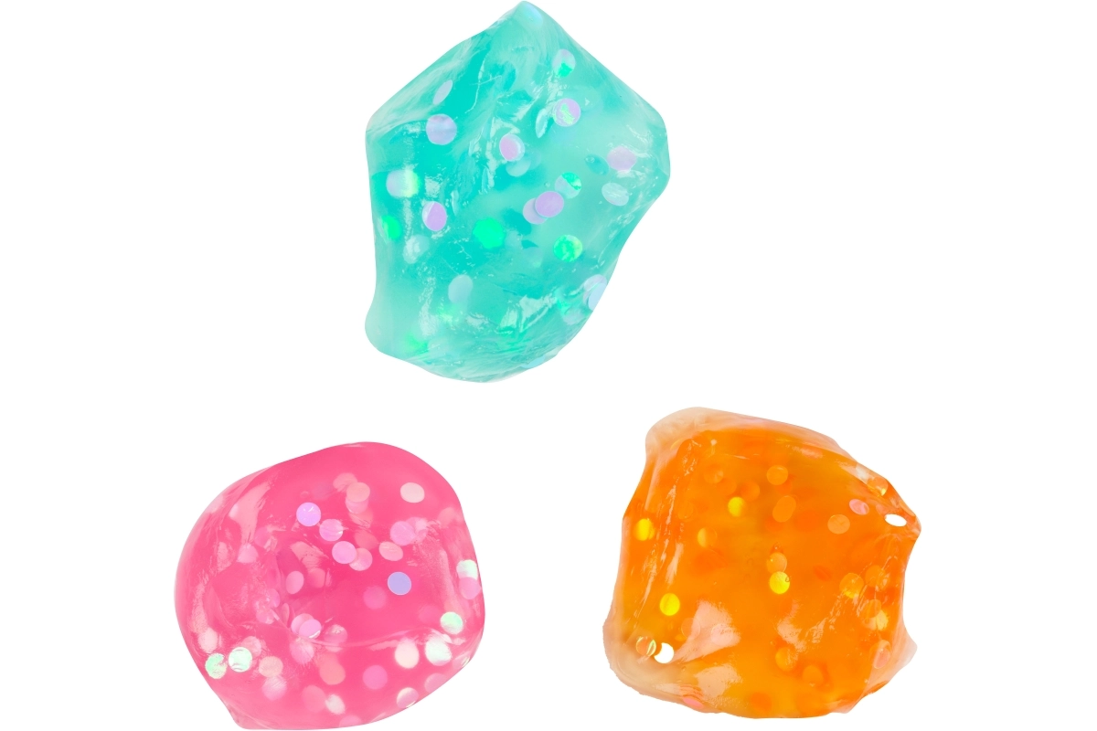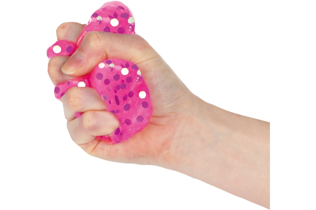 Tento barevný sliz s velkými třpytkami nabízí výborný smyslový zážitek – je příjemně vláčný, dá se natahovat, mačkat i tvarovat a při světle krásně jiskří. Ideální jako antistresová pomůcka i zábavná hračka pro děti od 3 let.