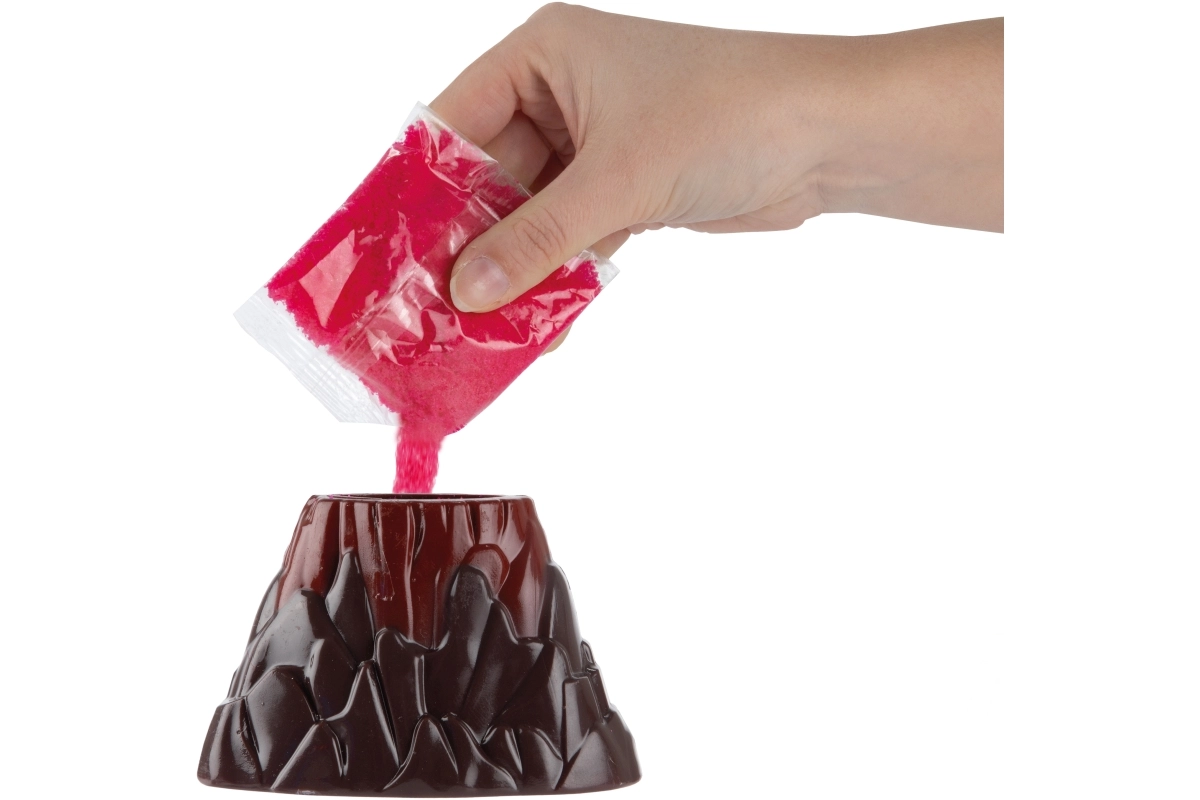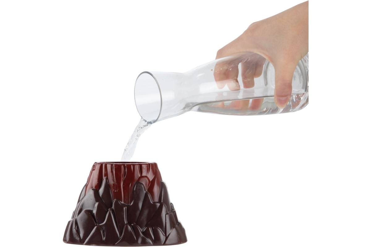 - Nasypte celý sáček do sopky, dolijte vodu po okraj, sledujte erupci
