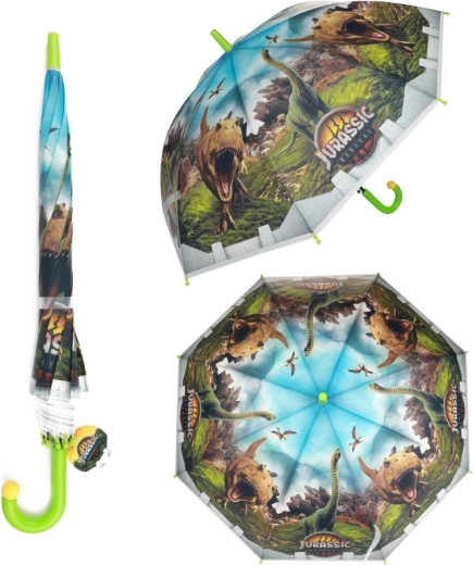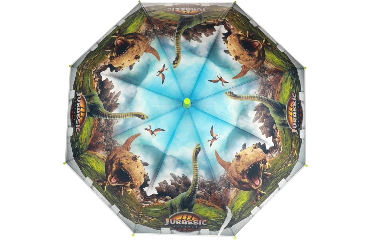 Objevte zábavný a praktický doplněk do deště: dětský deštník s motivem dinosaurů a logem Jurassic World. Pestrobarevný potisk, odolná vícedílná látková kopule a kovová žebra zajistí, že dítě zůstane v suchu a zároveň si užije originální design.
