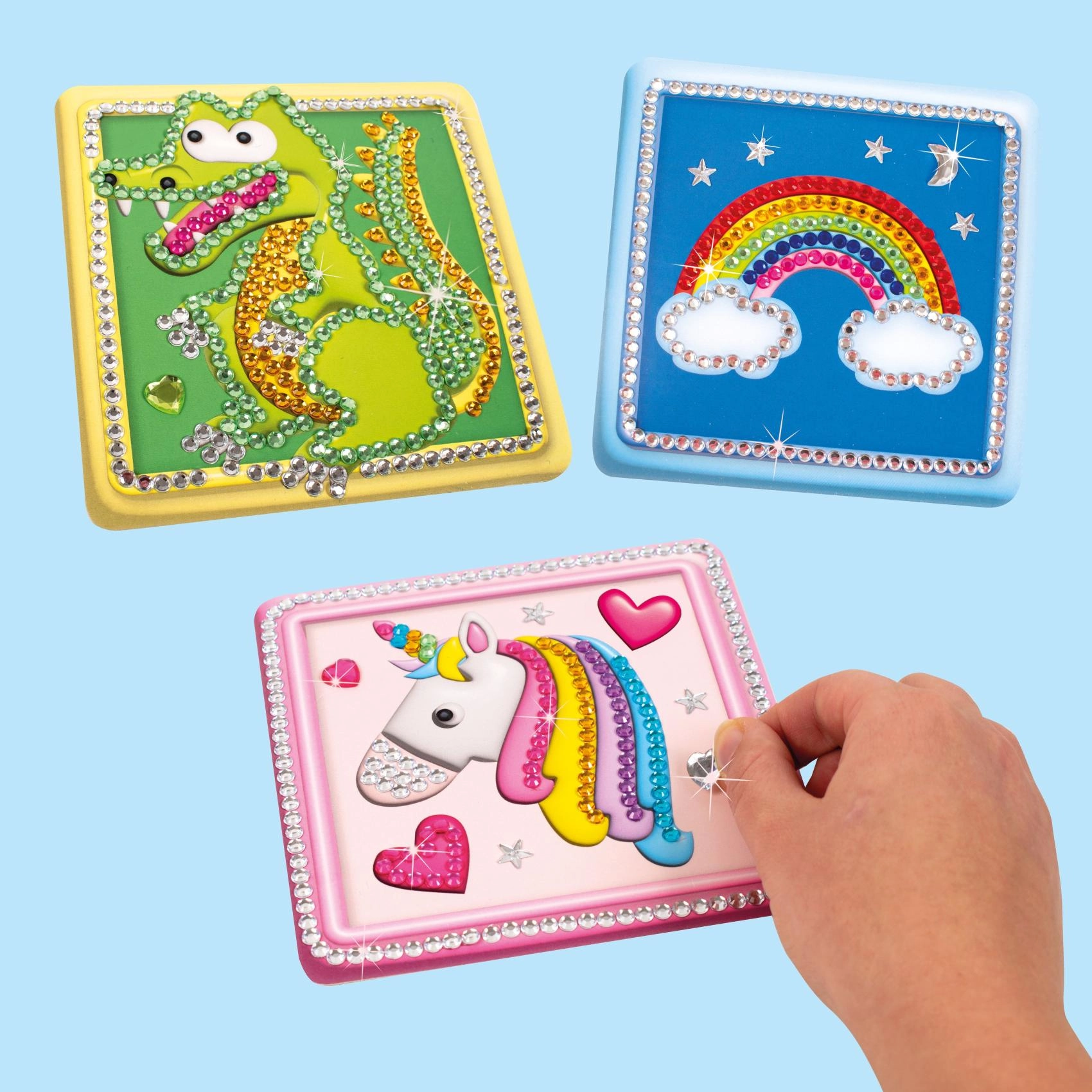 Objevte kouzlo diamond paintingu a proměňte volné chvilky v kreativní zážitek. Tato sada přináší tři motivy na pevných předlohách o rozměru 18 × 21 cm a veškeré doplňky, které potřebujete k pohodlnému lepení kamínků. Díky jednoduchému postupu je vhodná pro začátečníky i děti pod dohledem dospělých.