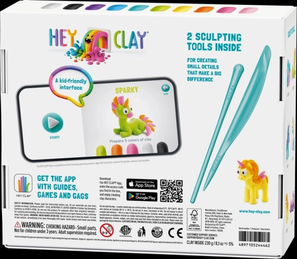 Součástí je přístupový kód do mobilní aplikace HEY CLAY, která nabízí animované návody krok za krokem. Děti se tak hravou formou naučí tvarovat jednotlivé části a skládat je do výsledných postaviček. Dva přiložené nástroje usnadňují tvarování detailů a textur.
