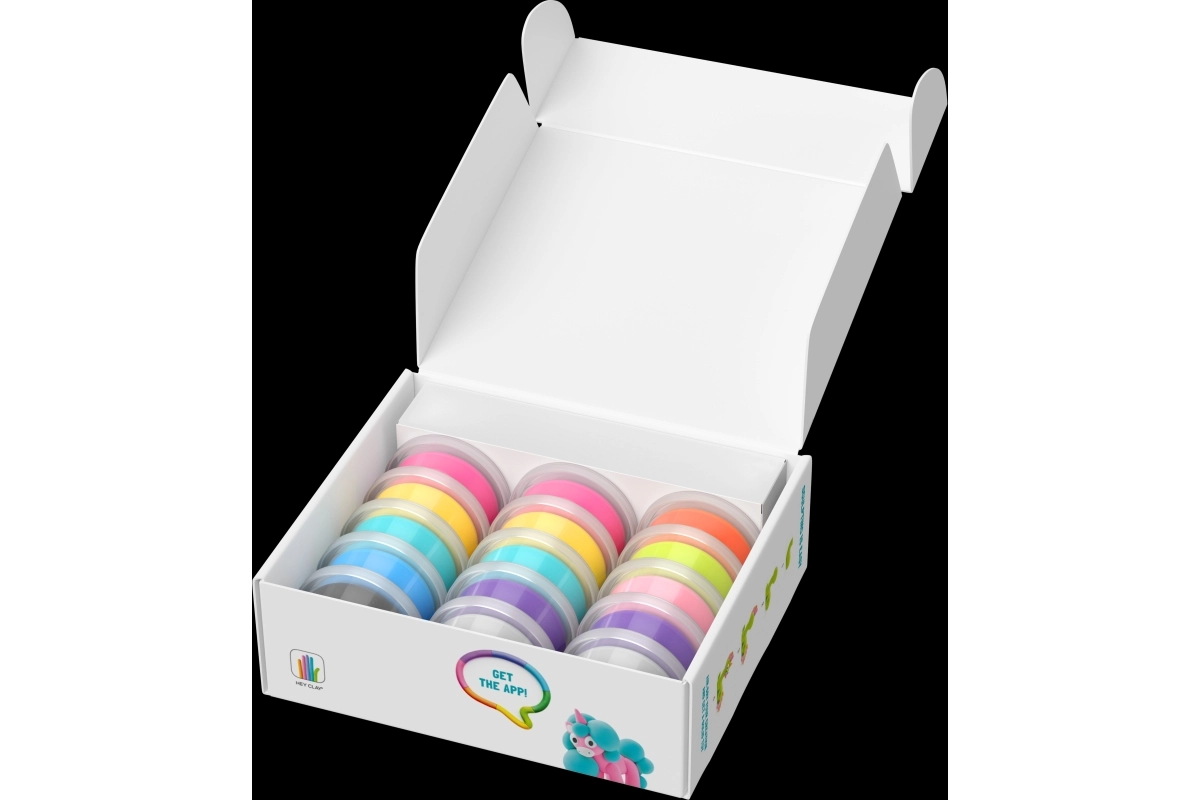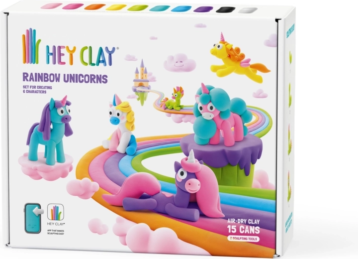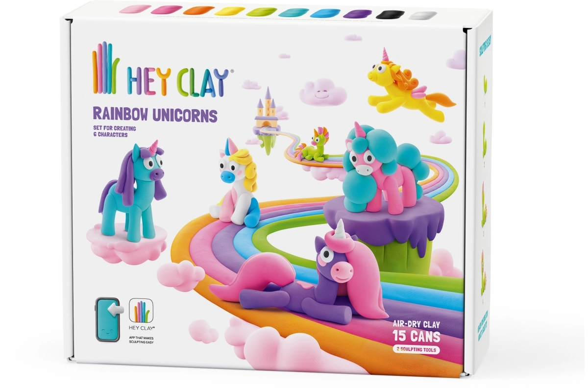 Sada Hey Clay – duhoví jednorožci je zábavným vstupem do světa modelování pro malé i velké tvůrce. Měkká, hebká a lehce tvarovatelná hmota v zářivých barvách se po dokončení samovolně vytvrdí na vzduchu, takže si děti mohou své výtvory uchovat a vystavit.