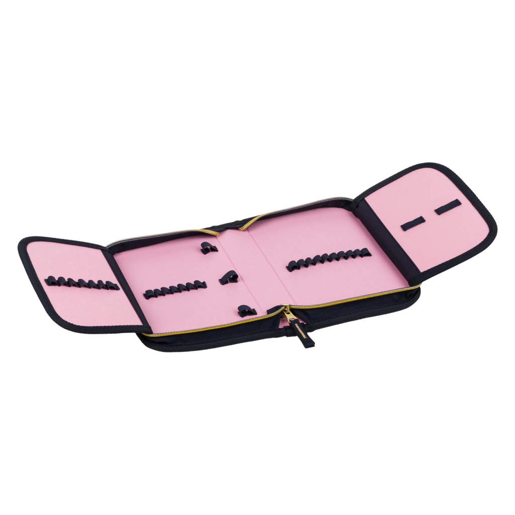 Set doplňuje klasický jednopatrový penál se dvěma chlopněmi, odolným zipem YKK, kapsičkou na drobnosti, okénkem na rozvrh a pevnými gumičkami i pro trojhranné pastelky. Penál je bez náplně a vyroben z recyklovaných materiálů. Pevný sáček na obuv či sport s omyvatelným povrchem, stahováním na tkanice a karabinkou umožňuje snadné připnutí k aktovce i nošení na zádech.