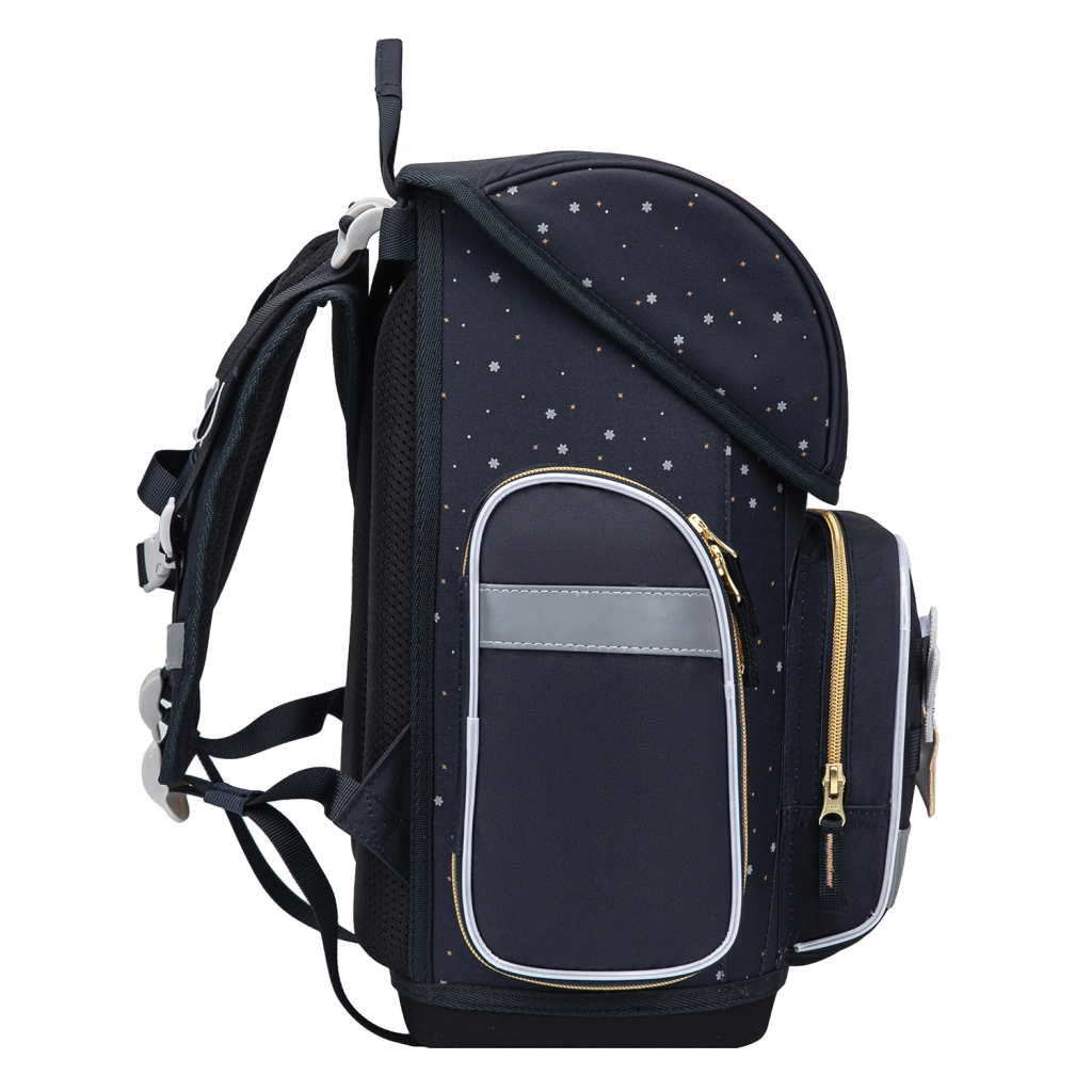 Praktická výbava zahrnuje přehledný vnitřní organizér s rozvrhem, stahovací popruh pro fixaci nejtěžších učebnic u zad, izolovanou přední kapsu na svačinu a dvě boční kapsy vhodné na láhve. Intuitivní magnetické zapínání Fidlock zajišťuje rychlé otevření a zavření. Bezpečnost podporují reflexní prvky po obvodu. Součástí je hravý systém vyměnitelných odznáčků pro personalizaci vzhledu.