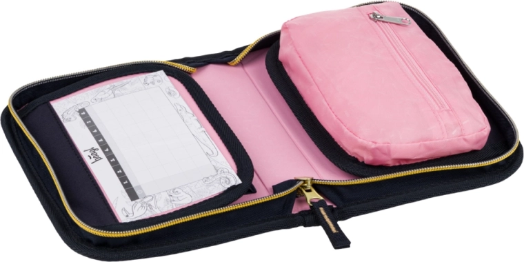 Vnitřek nabízí kapsičku na drobnosti, okénko na rozvrh hodin a pevné gumičky vhodné i pro trojhranné pastelky a fixy.