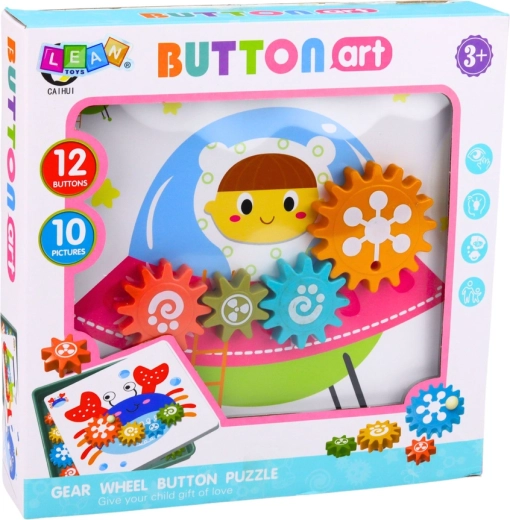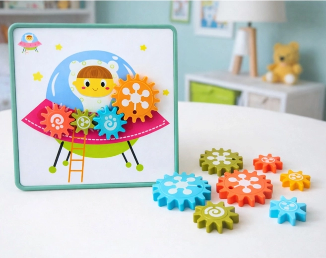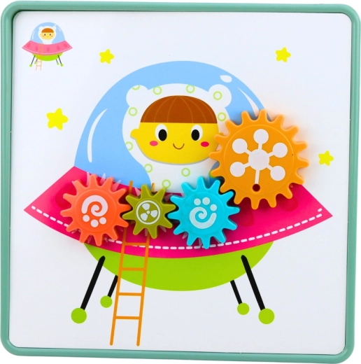 Tato chytrá skládačka propojuje hru a učení. Děti umisťují barevná ozubená kola do výřezů na tematických kartách a sledují, jak se po správném propojení všechna kola točí společně. Jednoduchou a názornou formou tak pochopí základy převodů a princip spolupráce jednotlivých prvků.