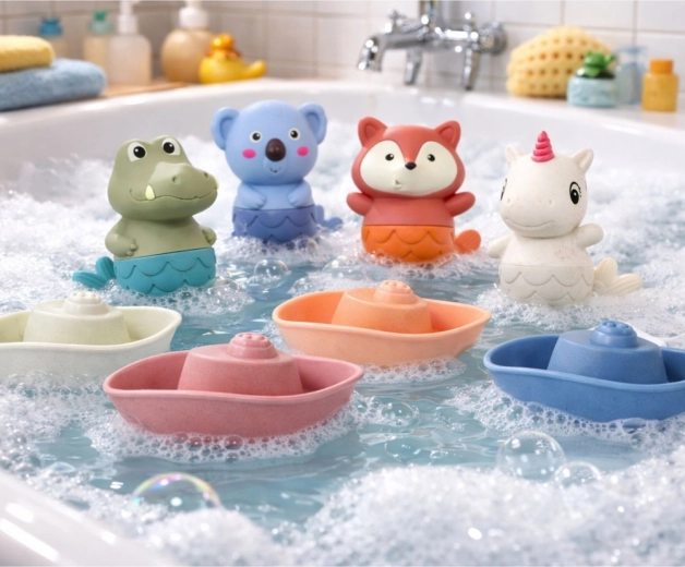Barevná sada hraček do koupele promění každé mytí ve zábavné dobrodružství. Obsahuje 13 dílů: rozpojitelná gumová zvířátka, plastové lodičky a gumové člunky, které plavou na vodě a po stisknutí stříkají. Měkký, bezpečný materiál a možnost spojování částí podporují jemnou motoriku, koordinaci oko–ruka i smyslový rozvoj.