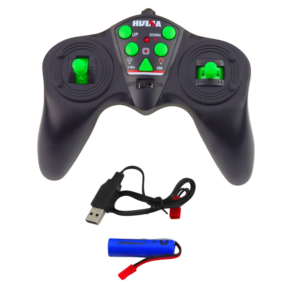 V balení najdete ovladač, USB kabel a akumulátor 3,7 V 500 mAh – stačí vložit 2× AA do ovladače a vyrazit.