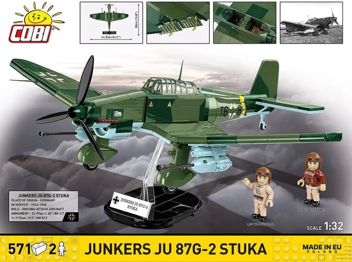 Součástí je prezentační stojan s štítkem „JUNKERS JU 87G-2 STUKA“ a dvě detailně potištěné figurky pilotů pro autentický vzhled exponátu.