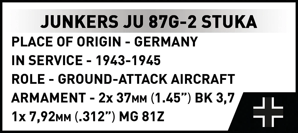 Věrně zpracovaná silueta Ju 87 G-2 s křídly do „W“, podvěsnými děly a novým prosklením kabiny. Ideální pro fanoušky vojenské historie i sběratele.