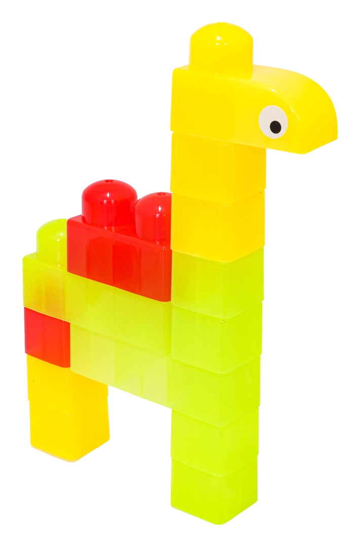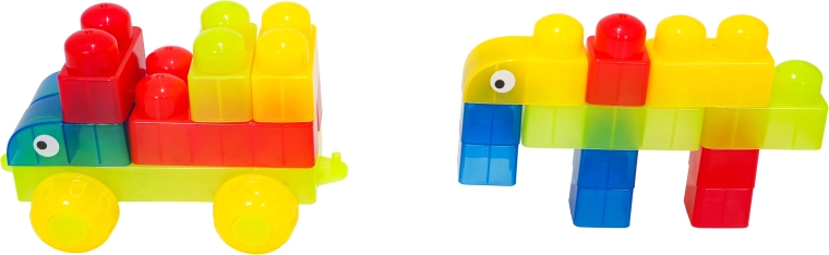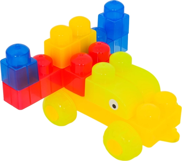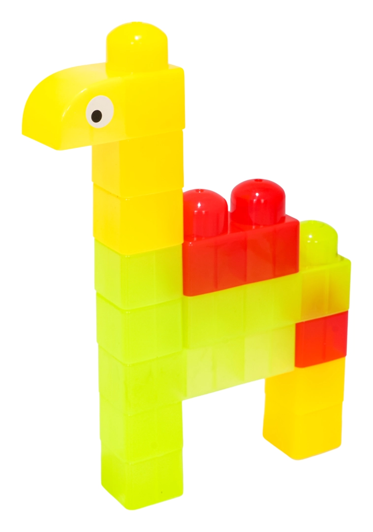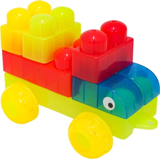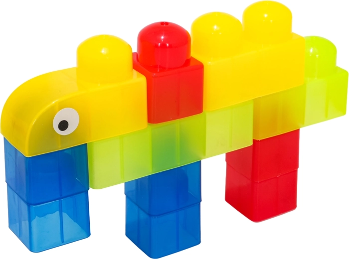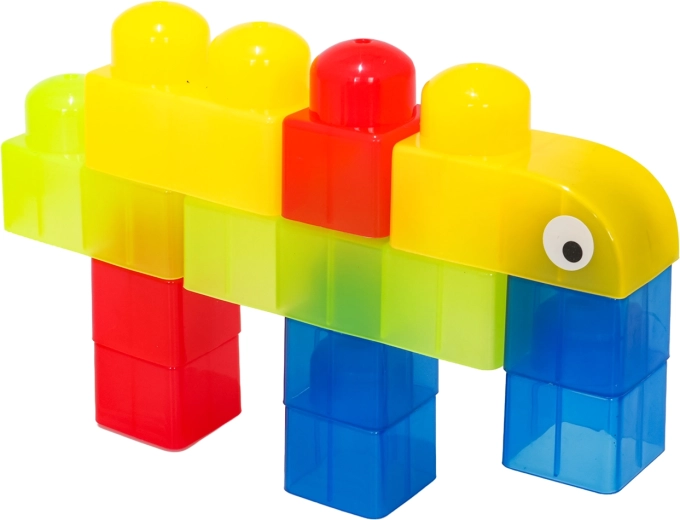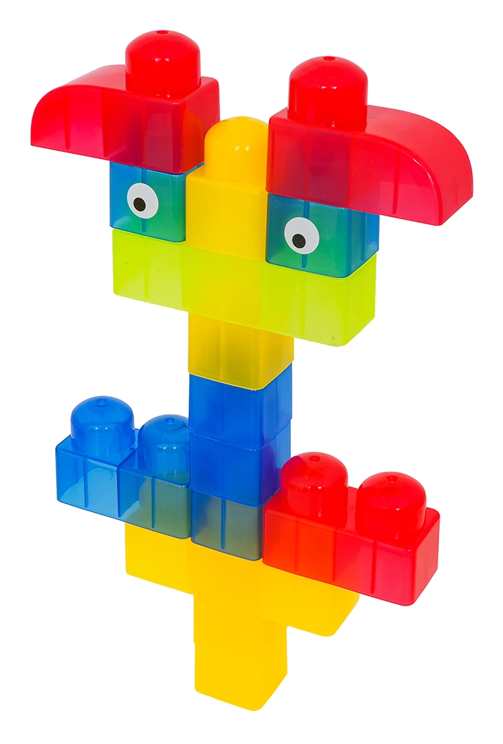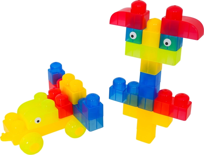 Díky rozmanitým tvarům (jednodílné, dvojité, trojité kostky, podvozek s koly a dílky se stříškou) postavíte roztomilá zvířátka, jednoduchá vozidla i barevné postavičky. Součástí jsou samolepky s očky pro ještě hravější výraz postaviček a obrázkový návod pro rychlý start. Stavění zlepšuje koordinaci oko–ruka, jemnou motoriku a podporuje tvořivou hru.