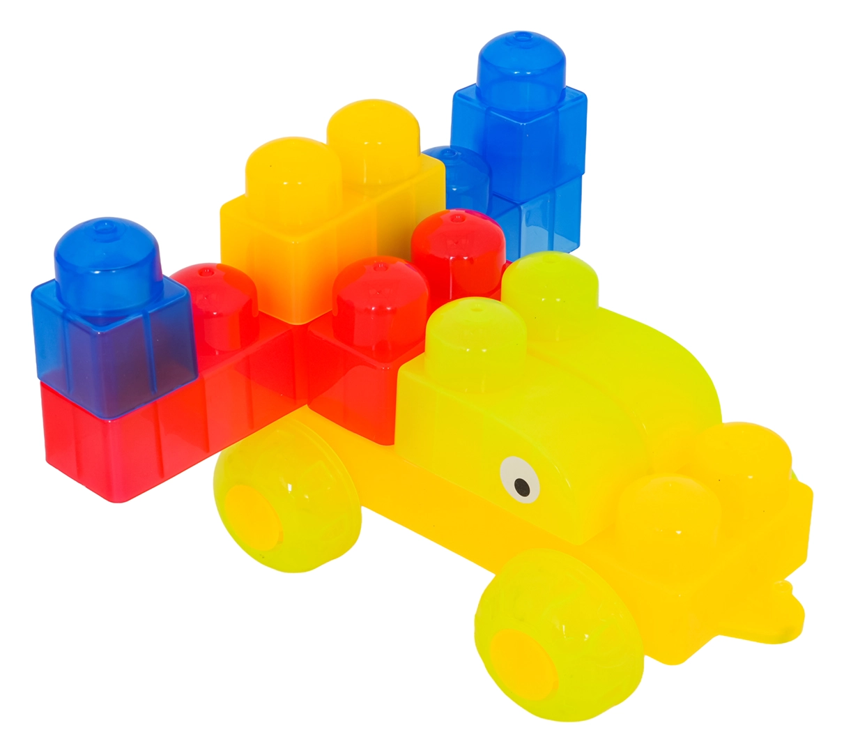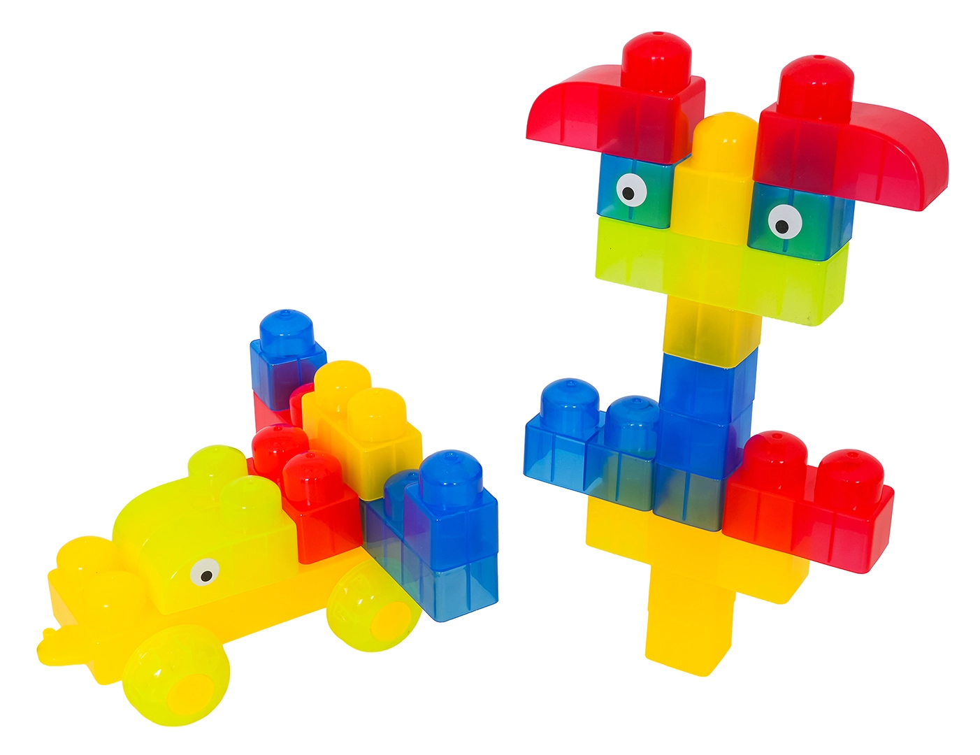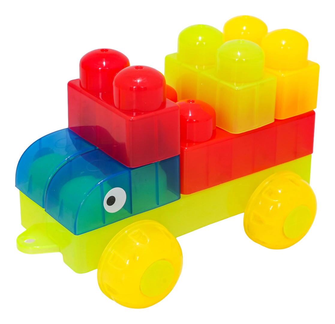 Díky rozmanitým tvarům (jednodílné, dvojité, trojité kostky, podvozek s koly a dílky se stříškou) postavíte roztomilá zvířátka, jednoduchá vozidla i barevné postavičky. Součástí jsou samolepky s očky pro ještě hravější výraz postaviček a obrázkový návod pro rychlý start. Stavění zlepšuje koordinaci oko–ruka, jemnou motoriku a podporuje tvořivou hru.