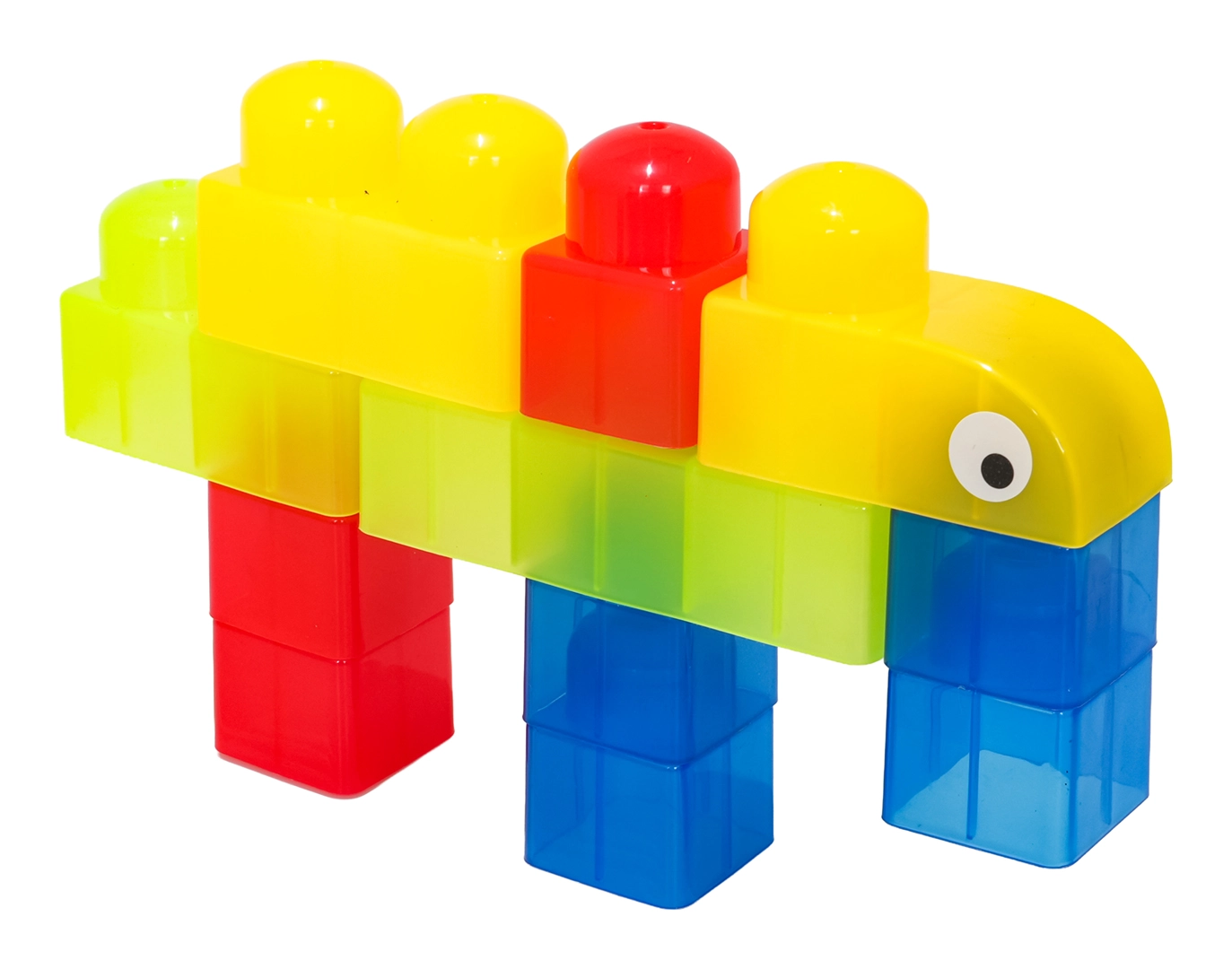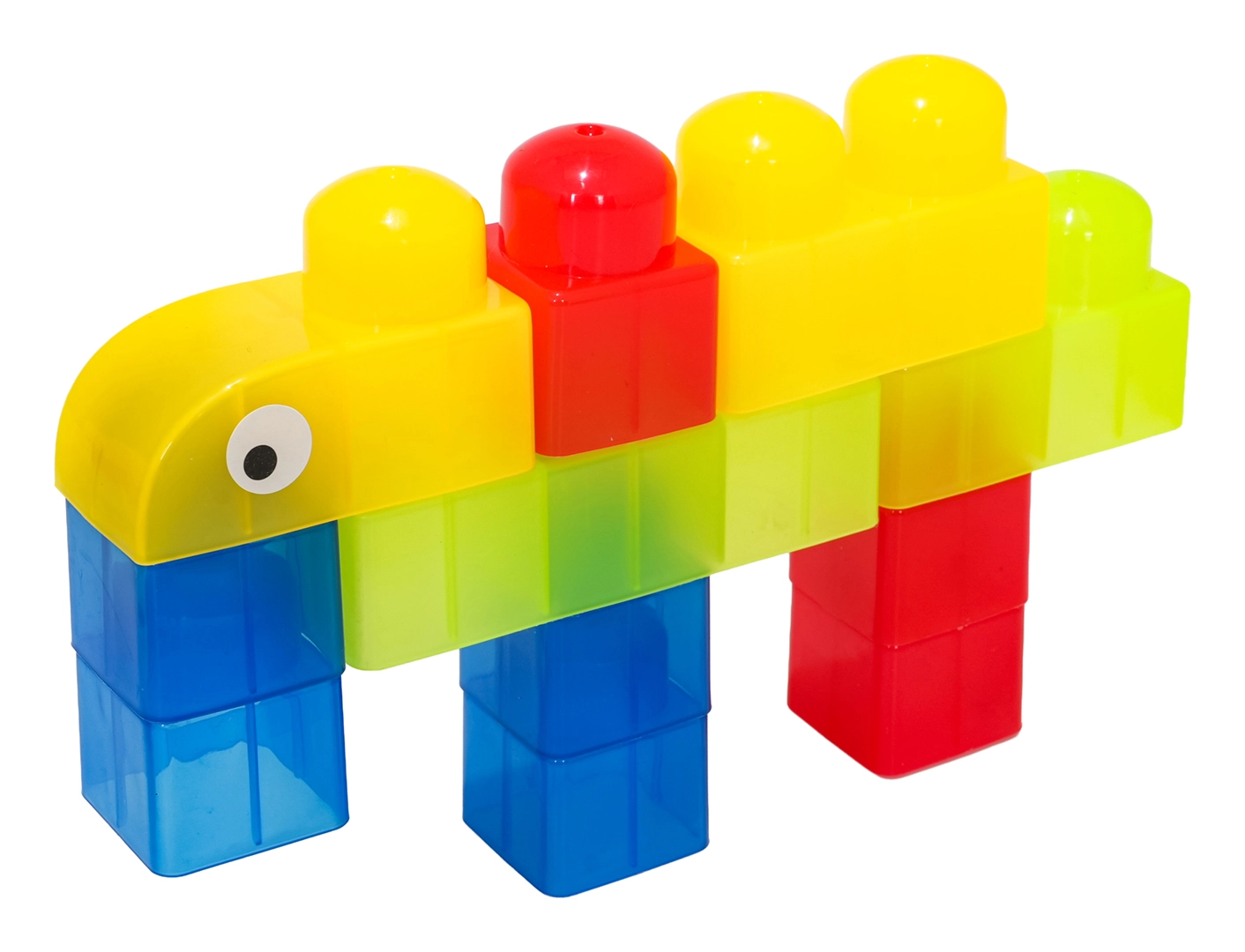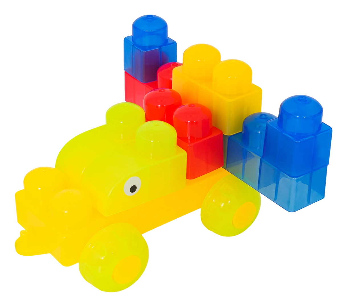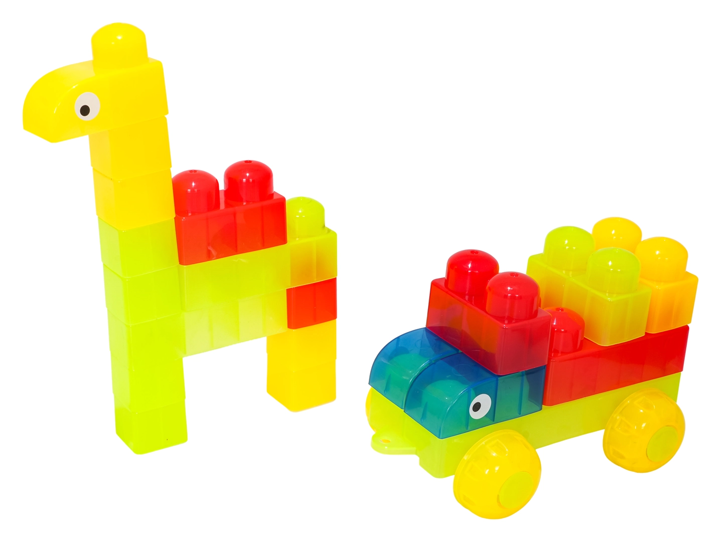 Díky rozmanitým tvarům (jednodílné, dvojité, trojité kostky, podvozek s koly a dílky se stříškou) postavíte roztomilá zvířátka, jednoduchá vozidla i barevné postavičky. Součástí jsou samolepky s očky pro ještě hravější výraz postaviček a obrázkový návod pro rychlý start. Stavění zlepšuje koordinaci oko–ruka, jemnou motoriku a podporuje tvořivou hru.