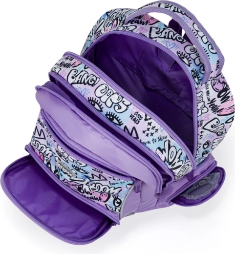 Dvě vnitřní komory, množství malých kapes a boční kapsy (otevřená na láhev, druhá na zip) udrží školní potřeby přehledně uspořádané.