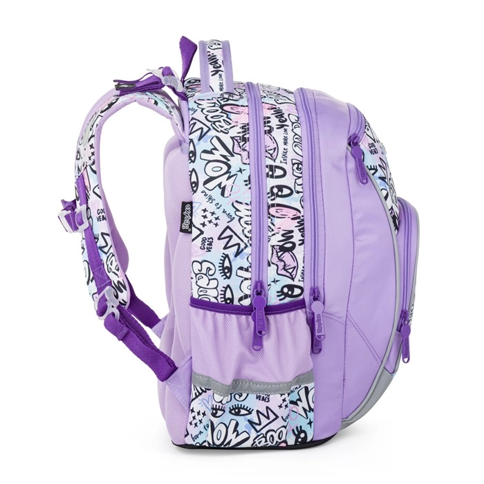 Vnitřní členění tvoří dvě prostorné komory na učebnice a sešity, doplněné o praktické menší kapsy pro drobnosti. Po stranách najdete dvě kapsy – jednu otevřenou na láhev a druhou na zip pro bezpečné uložení. Nechybí reflexní prvky pro lepší viditelnost za šera a háčky na uchycení dlouhých popruhů pro čistý a bezpečný vzhled.