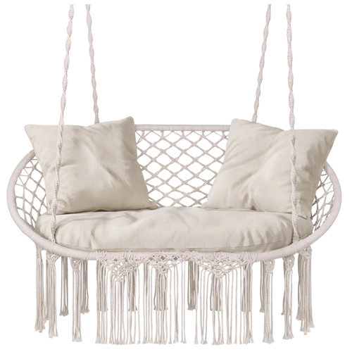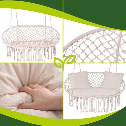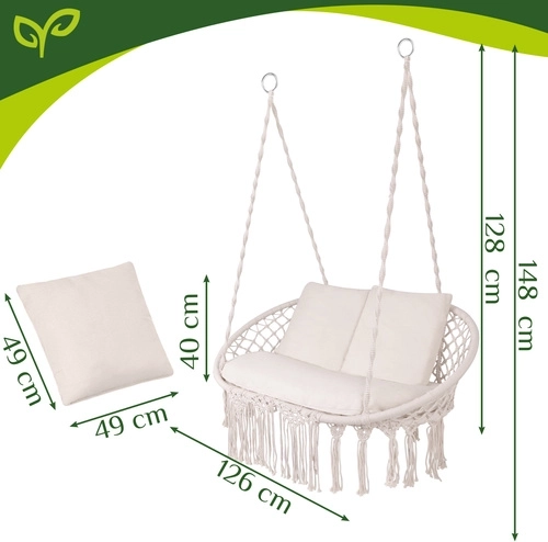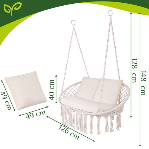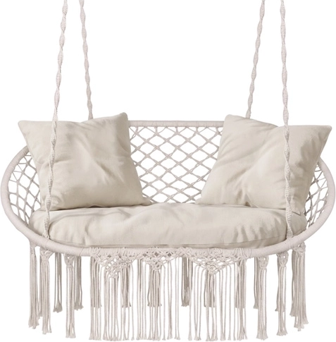 Houpačka je připravena k rychlé instalaci a nabízí více možností zavěšení – na trám, strop nebo stojan. Elegantní krémová barva a dekorativní třásně podtrhují boho design, který snadno sladíte s moderním i přírodním stylem.