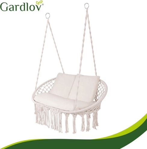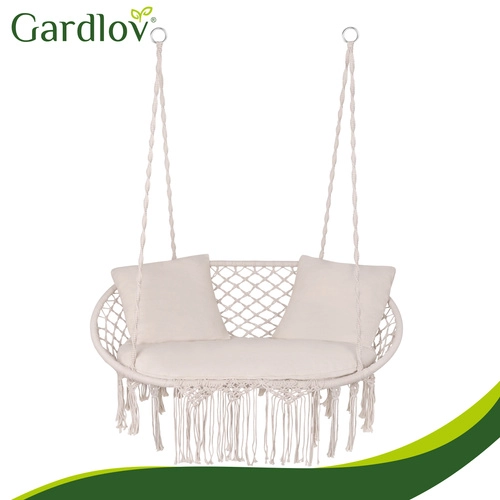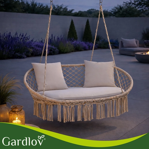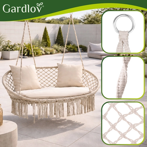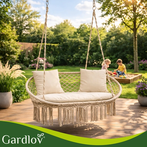 Užijte si dokonalý odpočinek na zahradě, terase i balkonu. Dvoumístná houpačka typu bocianí hnízdo GARDLOV nabízí prostorné sedadlo, nosnost až 300 kg a 3 měkké polštáře pro maximální pohodlí. Díky pevné kovové konstrukci a odolným lanům s kovovými oky je zavěšení stabilní a bezpečné. Krémové provedení v boho stylu krásně doplní každý exteriér i interiér.