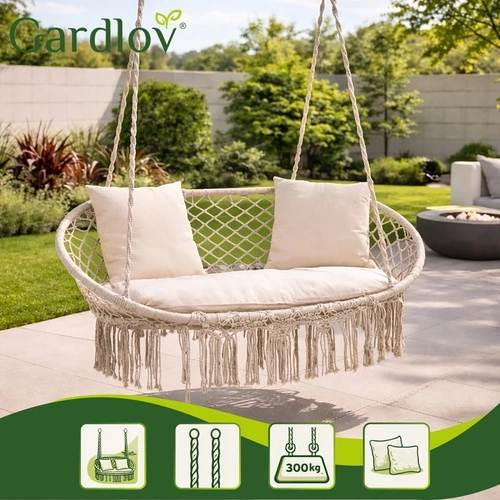 Hledáte pohodlné a stylové místo pro relax ve dvou? Dvoumístné bocianí hnízdo GARDLOV promění vaši terasu, balkon i obývací pokoj v útulnou zónu klidu. Široké sedadlo s měkkým polstrováním příjemně obejme tělo a podpoří pohodlí při sezení i pololehu. Odolná kovová konstrukce opletená materiálem a čtyři pevná lana s kovovými kroužky zajišťují stabilitu, bezpečnost a dlouhou životnost.