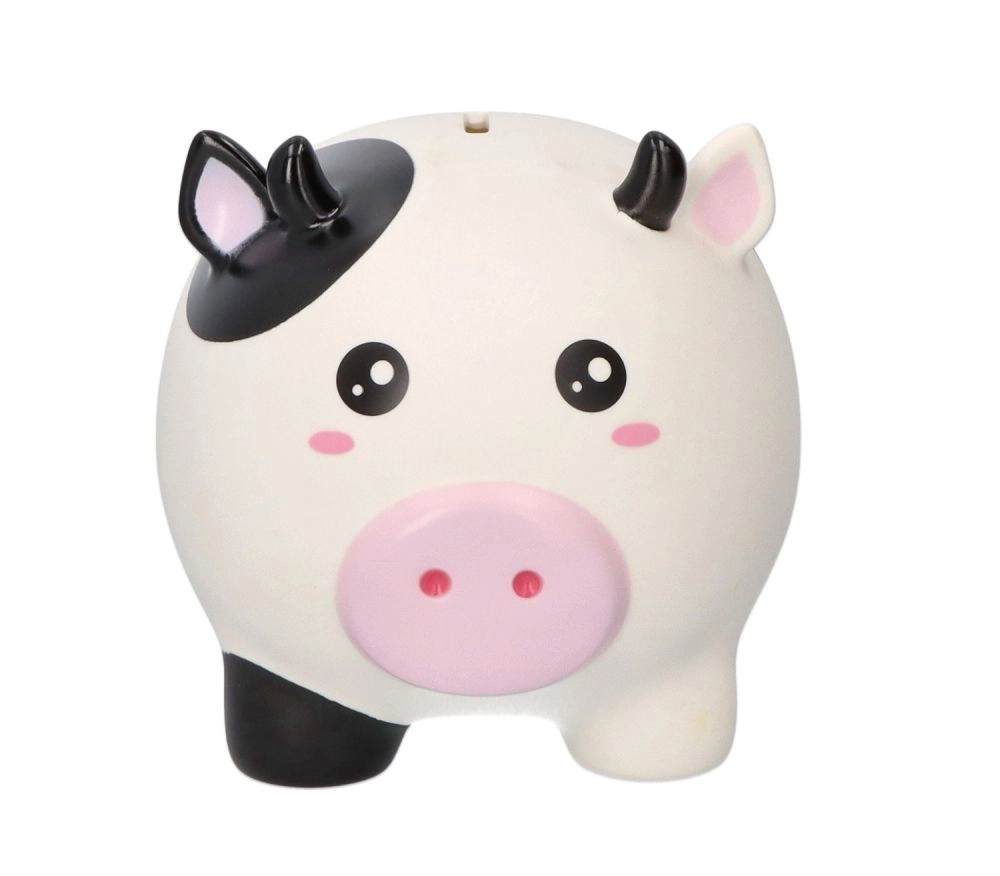 Kravička s černobílými skvrnami a růžovým čumáčkem promění šetření v zábavu – ideální do dětského pokoje i jako dárkový tip.