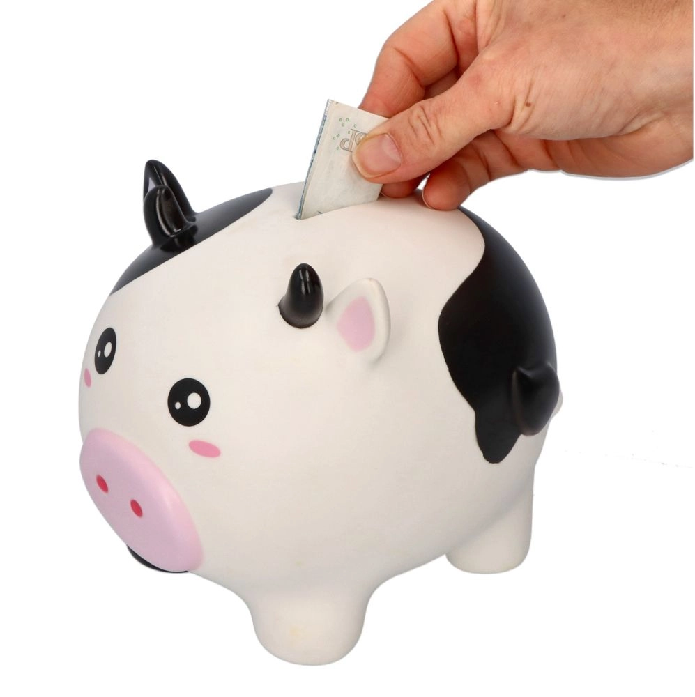 Tato velká pokladnička ve tvaru kravičky zaujme na první pohled svým milým designem s černobílými skvrnami a růžovým čumáčkem. Široký otvor nahoře usnadňuje vkládání mincí i bankovek, takže spoření je zábava pro malé i velké.