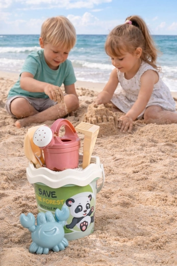 - Obsah sady: kyblík, konvička 0,5 l, sítko, lopatka, hrabičky, tvořítko krab