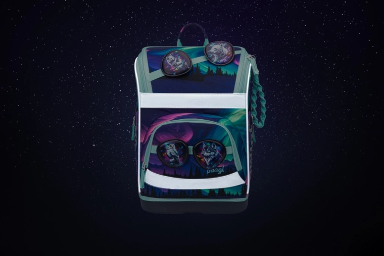 Součástí setu je prostorný jednopatrový penál s chlopněmi, pevnými gumičkami a okénkem na rozvrh, dále praktický sáček s kapsou na zip na přezůvky či sport a peněženka na krk se jmenovkou a bezpečnostní pojistkou. Vše sladěné do atraktivního designu Aurora s reflexními prvky pro lepší viditelnost.